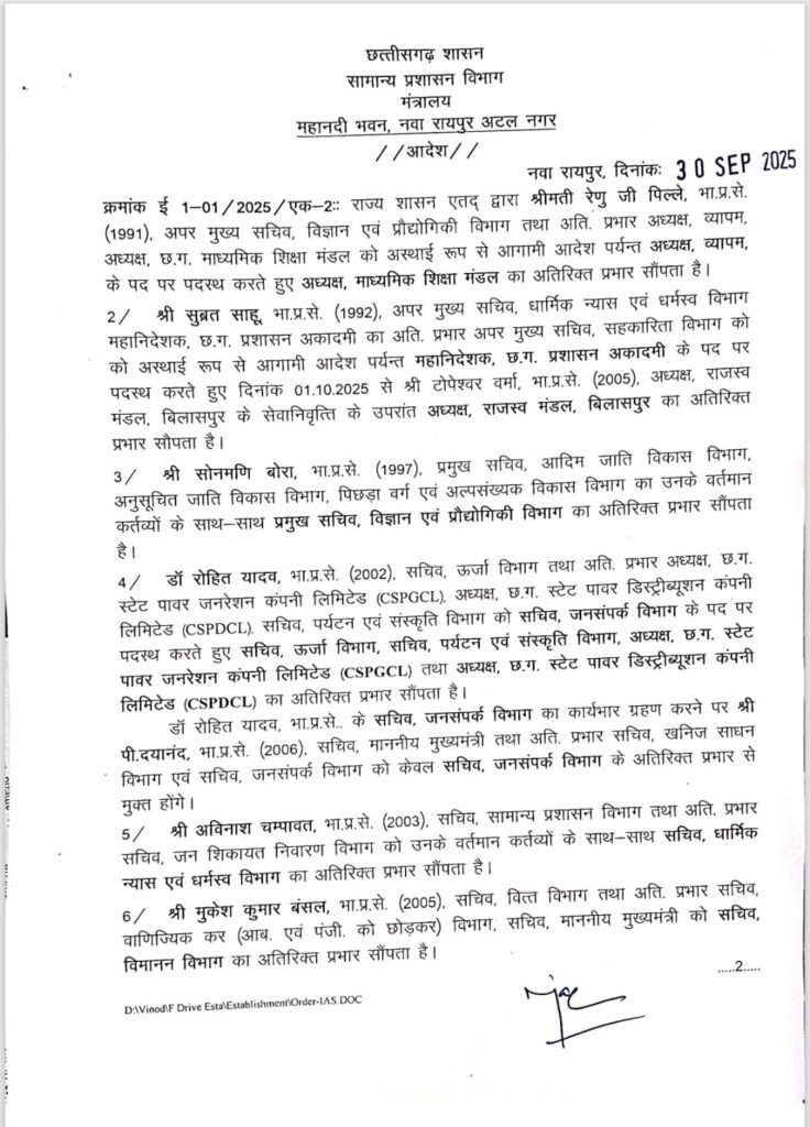 छत्तीसगढ़ में नए मुख्य सचिव विकासशील के पदभार ग्रहण करने के साथ ही राज्य सरकार ने बड़े पैमाने पर आईएएस अफसरों के प्रभार में बदलाव किया है। राज्य सरकार ने 14 आईएएस अफसरों को नई जिम्मेदारी सौंपी है।