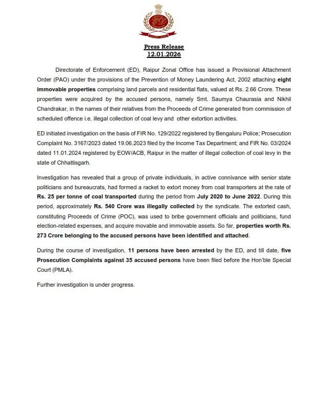 रायपुर। प्रवर्तन निदेशालय (ED), रायपुर जोनल कार्यालय ने प्रिवेंशन ऑफ मनी लॉन्ड्रिंग एक्ट (PMLA), 2002 के तहत बड़ी कार्रवाई करते