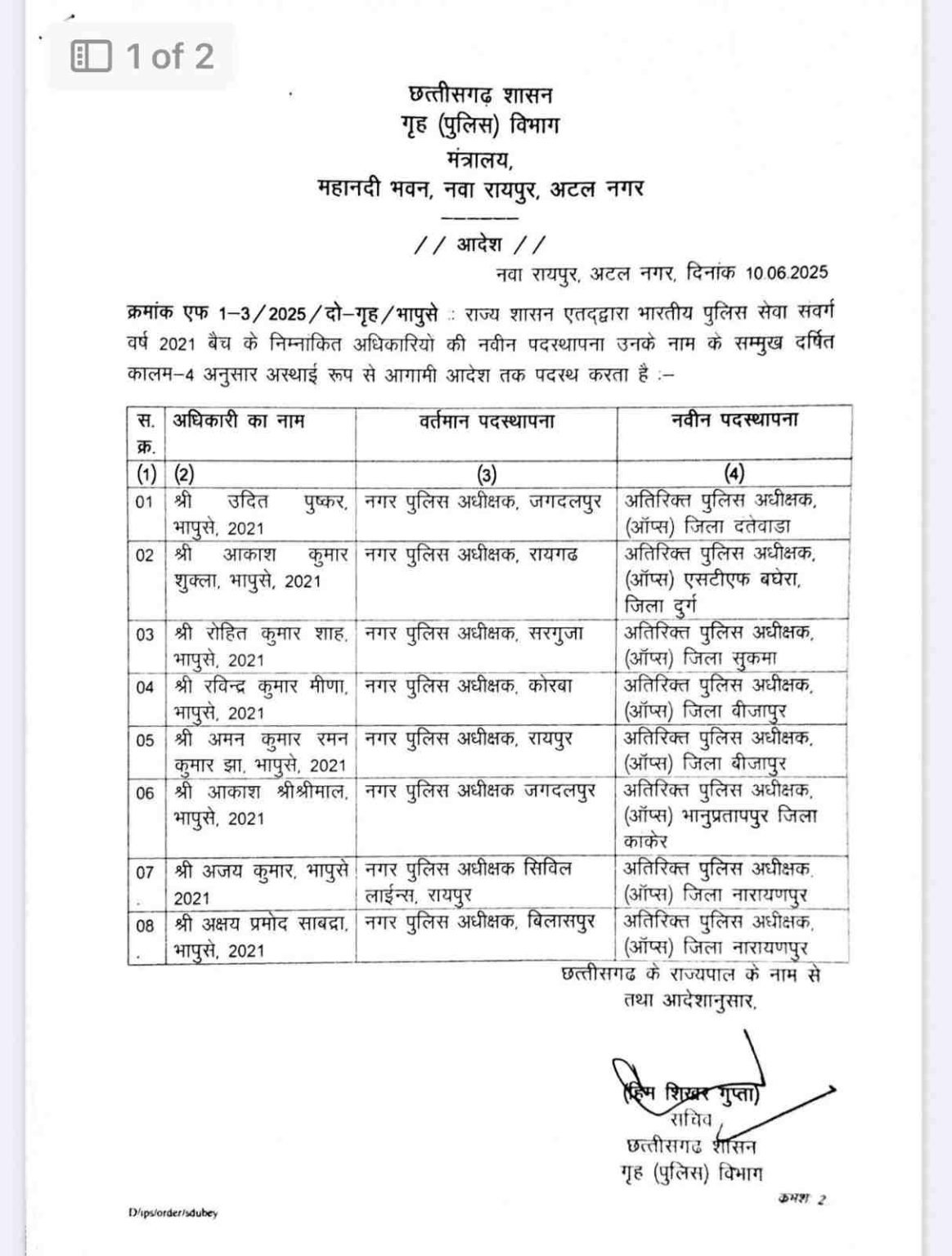 रविंद्र कुमार मीणा कोरबा से अतिरिक्त पुलिस अधीक्षक बीजापुर, अमन कुमार झा नगर पुलिस अधीक्षक रायपुर से अतिरिक्त पुलिस अधीक्षक जिला बीजापुर, आकाश श्रीश्रीमाल नगर पुलिस अधीक्षक से अतिरिक्त पुलिस अधीक्षक भानुप्रतापपुर।