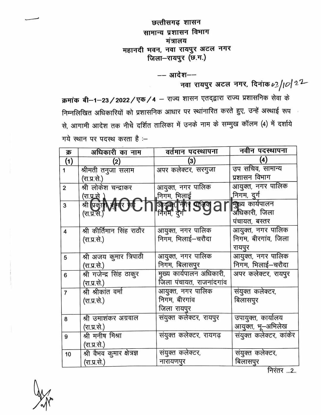 TRANSFER BREAKING : राज्य प्रशासनिक सेवा के 20 अधिकारियों का तबादला, दुर्ग, भिलाई, बिलासपुर सहित 5 निगम कमिश्नर भी बदले गए, देखिए सूची