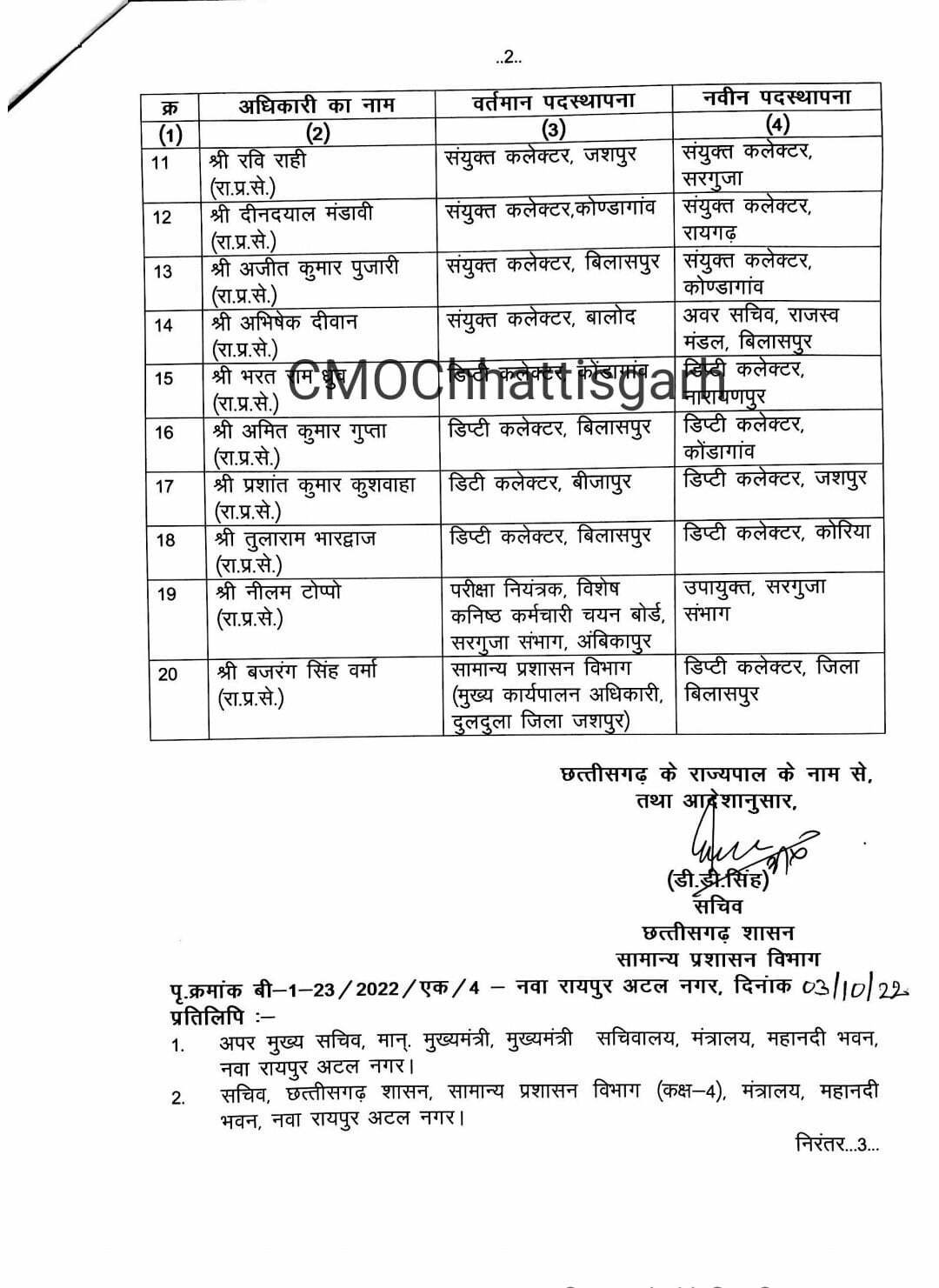 छत्तीसगढ़ में भारतीय प्रशासनिक सेवा के अधिकारियों के साथ ही राज्य सरकार ने राज्य प्रशासनिक सेवा के 20 अधिकारियों के तबादले किए हैं। जिन अधिकारियों का तबादला किया गया है उनमें दुर्ग, भिलाई, भिलाई-चरौदा, बिलासपुर और बीरगांव के कमिश्नर भी शामिल हैं।