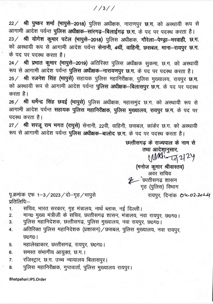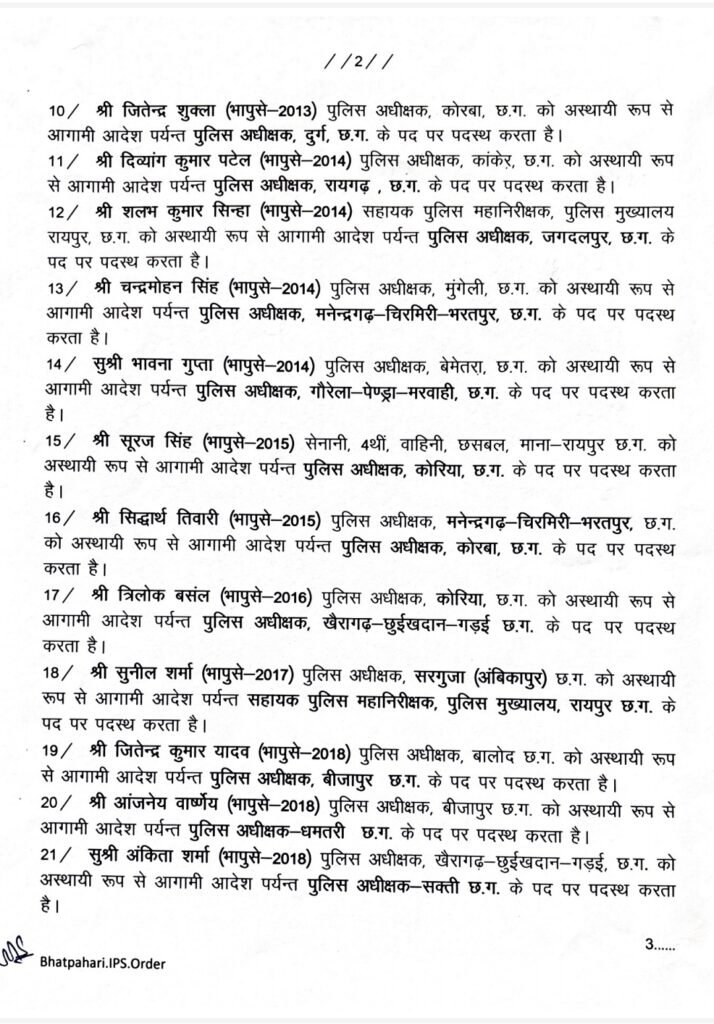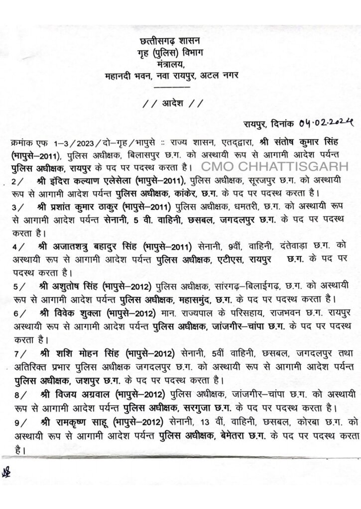 05/02/2024 IPS Transfer: छत्तीसगढ़ में बड़ी संख्या में IPS अफसरों का तबादला, राजधानी सहित कई जिलों के SP और IG बदले, अमरेश मिश्रा, दीपांशु काबरा सहित इन्हें मिली नई पोस्टिंग Admin September 26, 2022 छत्तीसगढ़ में देर रात राज्य सरकार ने बड़ी प्रशासन सर्जरी करते हुए कई जिलों के IPS अफसरों का तबादला किया है। Related News: Big Breaking: नंदकुमार साय कांग्रेस में हुए शामिल, CM भूपेश और मोहन मरकाम ने दिलाई सदस्यता ED Raid: छत्तीसगढ़ में CM के बेहद करीबियों के ठिकानों पर ED का छापा, भूपेश बघेल ने बताया बर्थडे गिफ्ट सीएम भूपेश ने ED, IT और CBI को बताया लोकतंत्र के लिए खतरा, अडानी पर दिया ये सनसनीखेज बयान