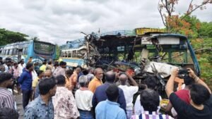 चेन्नई।  तमिलनाडु के तेनकासी जिले में सोमवार की सुबह एक दिल दहला देने वाली सड़क दुर्घटना हुई, जिसमें दो निजी बसों की आमने-सामने टक्कर में छह लोगों की मौत हो गई.इस हादसे में 28 यात्री घायल हुए, जिनमें कई की स्थिति चिंताजनक बनी हुई है.घटना के बाद पूरे इलाके में अफरा-तफरी का माहौल था और स्थानीय लोगों ने प्रशासन के साथ मिलकर बचाव कार्य में महत्वपूर्ण भूमिका निभाई