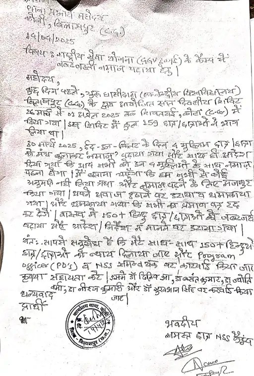 एक छात्र ने बताया, “हमें कहा गया कि नमाज पढ़ना सामुदायिक सेवा का हिस्सा है। जब हमने मना किया, तो हमें डराया गया कि इसका असर हमारी पढ़ाई और कैंप के सर्टिफिकेट पर पड़ सकता है। यह पूरी तरह से ब्रेनवॉश करने की कोशिश थी।” छात्रों ने इसकी लिखित शिकायत कोनी थाने में दर्ज कराई है और विश्वविद्यालय प्रशासन से निष्पक्ष जांच की मांग की है।