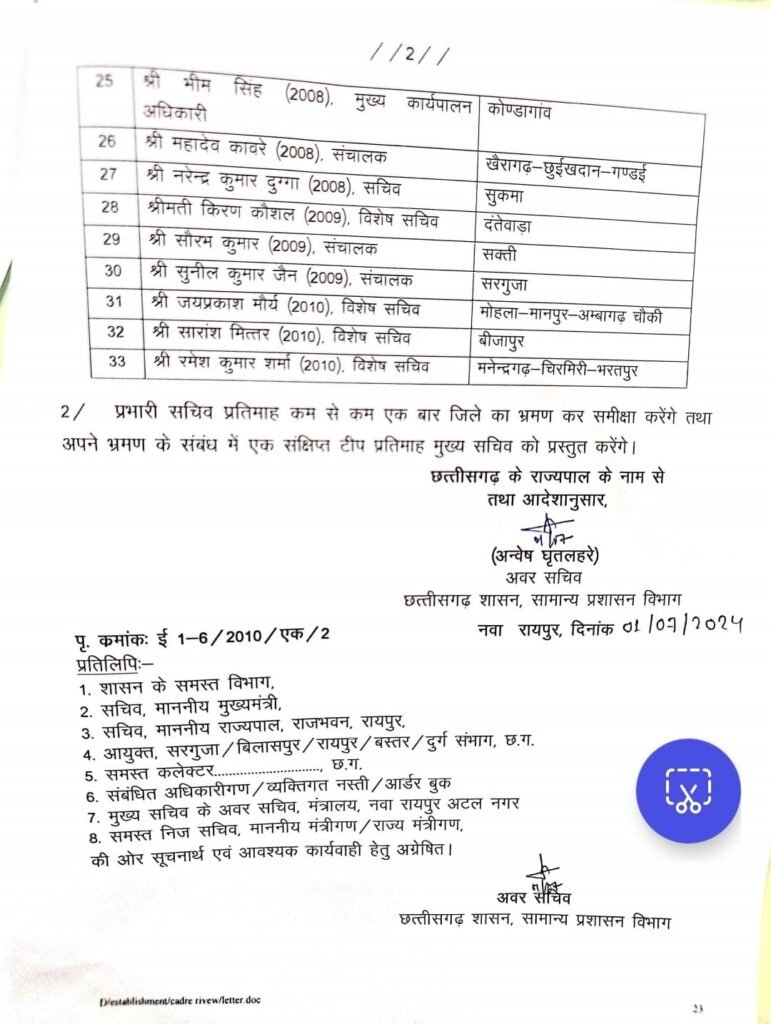 छत्तीसगढ़ के सभी जिलों में प्रभारी सचिवों की नियुक्ति, देखिए किसे कहां की मिली जिम्मेदारी
