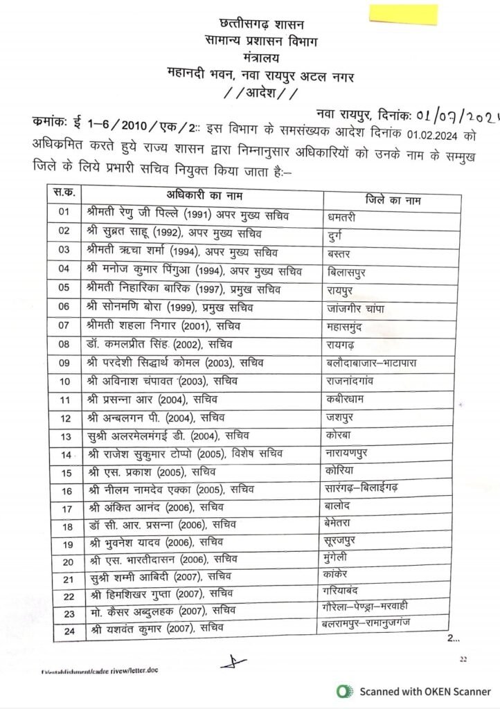 छत्तीसगढ़ के सभी जिलों में प्रभारी सचिवों की नियुक्ति, देखिए किसे कहां की मिली जिम्मेदारी