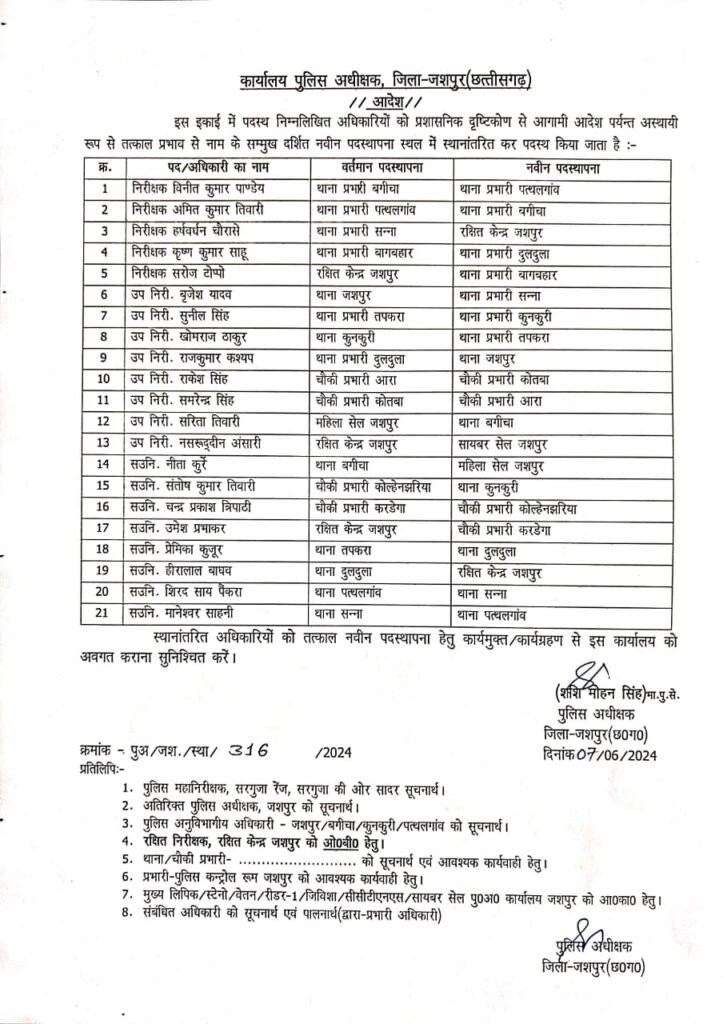 इसके साथ ही जशपुर जिले में पुलिस अधीक्षक ने 5 निरीक्षक, 8 उप निरीक्षक, 8 एएसआई का तबादला किया है।