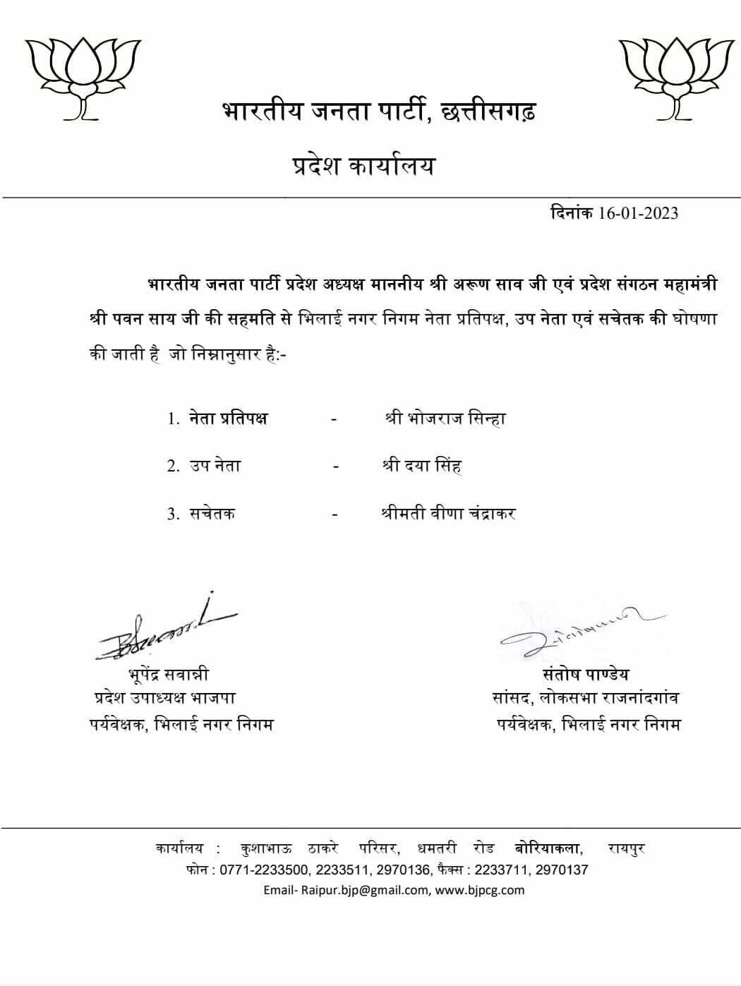 भिलाई नगर निगम को 2 साल बाद मिला नेता प्रतिपक्ष, बीजेपी ने उपनेता औऱ सचेतक की भी की घोषणा, इन्हें दी जिम्मेदारी