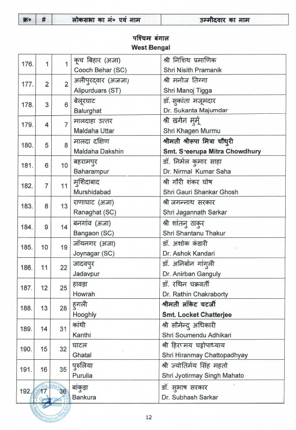 पार्टी की ओर से पहली लिस्ट में उत्तर प्रदेश की 80 में से 51 सीटों पर प्रत्याशियों के नामों का ऐलान किया है। पश्चिम बंगाल की 26, मध्य प्रदेश की 24, राजस्थान की 15, केरल की 12, तेलंगाना की 9, असम की 11, गुजरात की 15, झारखंड की 11, दिल्ली की 5, जम्मू कश्मीर की 2, उत्तराखंड की 3 सीट के अलावा छत्तीसगढ़, गोवा, अंडमान और दमन दीव की 1-1 सीटों पर भी नामों का ऐलान किया है।