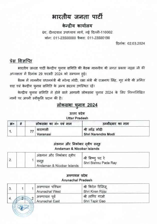 लोकसभा चुनाव 2024 के लिए बीजेपी ने 195 उम्मीदवारों की पहली लिस्ट जारी कर दी है। पहली लिस्ट में मौजूदा कई सांसदों के टिकट काट दिए गए हैं। वहीं पीएम मोदी, अमित शाह, राजनाथ सिंह सहित कई दिग्गज नेताओं के नाम लिस्ट में शामिल है।