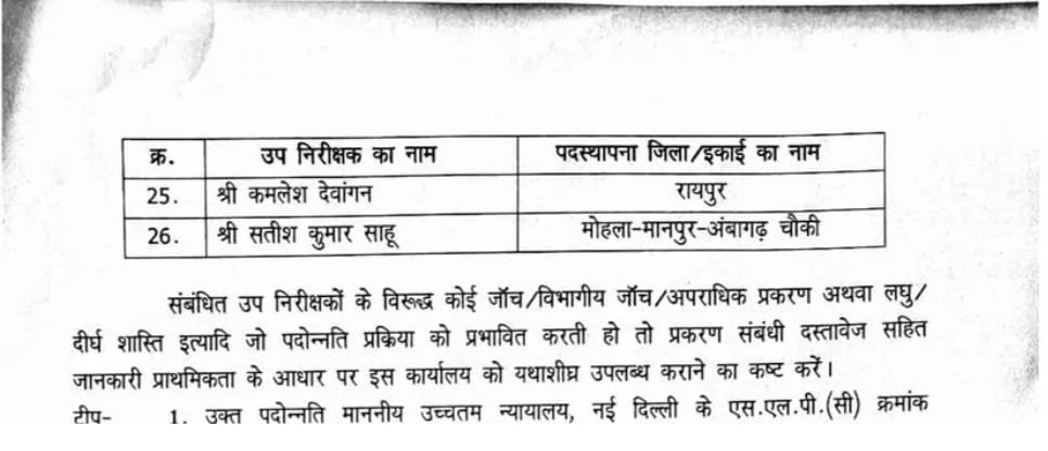 पुलिस के 26 सब इंस्पेक्टर का प्रमोशन कर इंस्पेक्टर के पद पर नियुक्त किया है। जिसको लेकर DGP अशोक जुनेजा ने आदेश भी जारी कर दिया है। प्रमोट किए गए उप निरीक्षकों में रायपुर, बस्तर, बलौदाबाजार, नाराणपुर, कांकेर, दुर्ग और अन्य जिलों के नाम शामिल हैं।