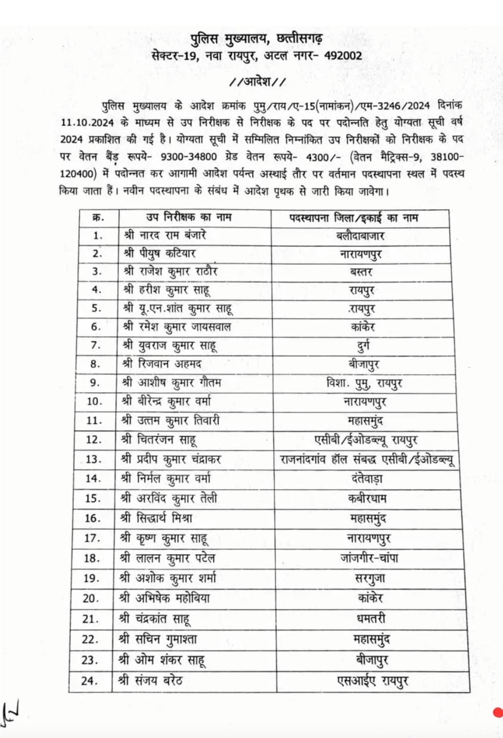 पुलिस मुख्यालय से जारी आदेश के मुताबिक, उप निरीक्षक से निरीक्षक के पद पर पदोन्नति के लिए योग्यता सूची वर्ष 2024 प्रकाशित की गई है। योग्यता सूची में सम्मिलित निम्नांकित उप निरीक्षकों को निरीक्षक के पद पर वेतन बैंड़ रूपये 9300-34800 ग्रेड वेतन रूपये 4300/- (वेतन मैट्रिक्स-9, 38100- 120400) में पदोन्नत कर आगामी आदेश पर्यन्त अस्थाई तौर पर वर्तमान पदस्थापना स्थल में पदस्थ किया जाता है। नवीन पदस्थापना के संबंध में आदेश अलग से जारी किया जावेगा।