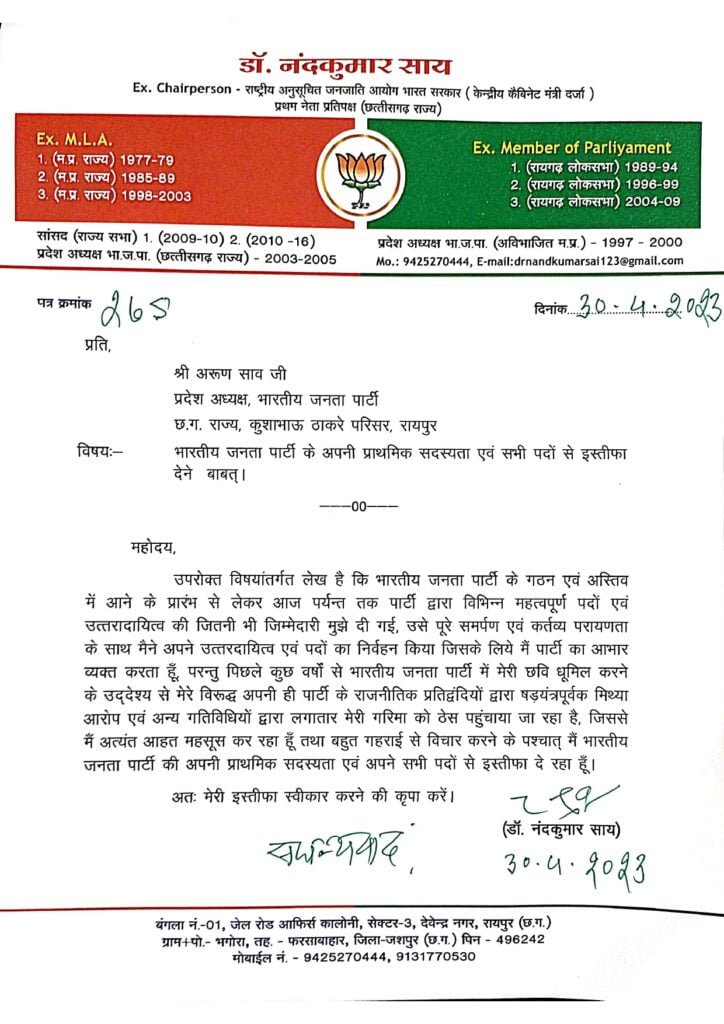 छत्तीसगढ़ में 6 महीने बाद होने जा रहे विधानसभा चुनाव से पहले बीजेपी को बड़ा झटका लगा है। बीजेपी में प्रदेश के भीतर सबसे बड़ा आदिवासी चेहरा माने जाने वाले नंद कुमार साय ने पार्टी से इस्तीफा दे दिया है। साय ने पार्टी के सभी पदों के साथ ही प्राथमिक सदस्यता से भी अपना इस्तीफा दे दिया है।