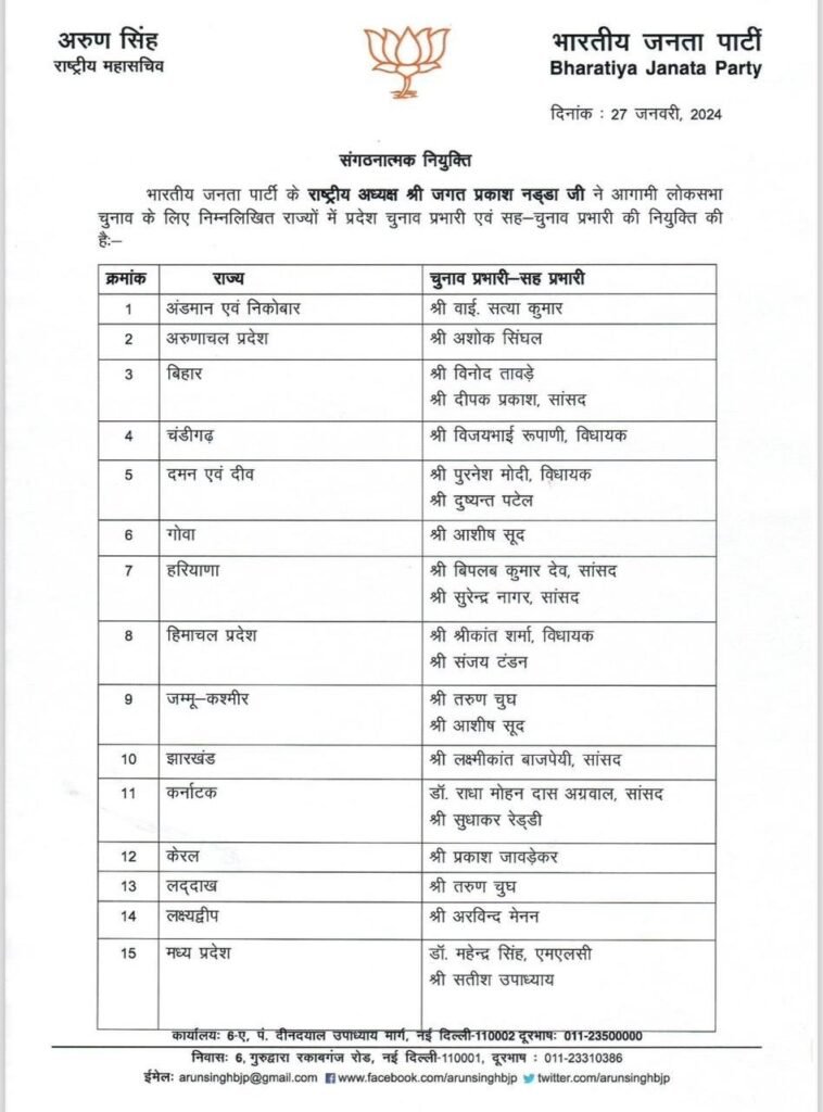 भाजपा ने आगामी 2024 लोकसभा चुनाव के मद्देनजर राज्यों और केंद्र शासित प्रदेशों के लिए चुनाव प्रभारियों और सह-प्रभारियों की नियुक्ति की है। बैजयंत पांडा उत्तर प्रदेश के नए प्रभारी होंगे। विनोद तावड़े को बिहार का चुनाव प्रभारी नियुक्त किया गया है। वहीं ओडिशा की जिम्मेदारी सांसद विजयपाल सिंह तोमर और छत्तीसगढ़ की आदिवासी महिला विधायक लता उसेंडी को दी गई है।