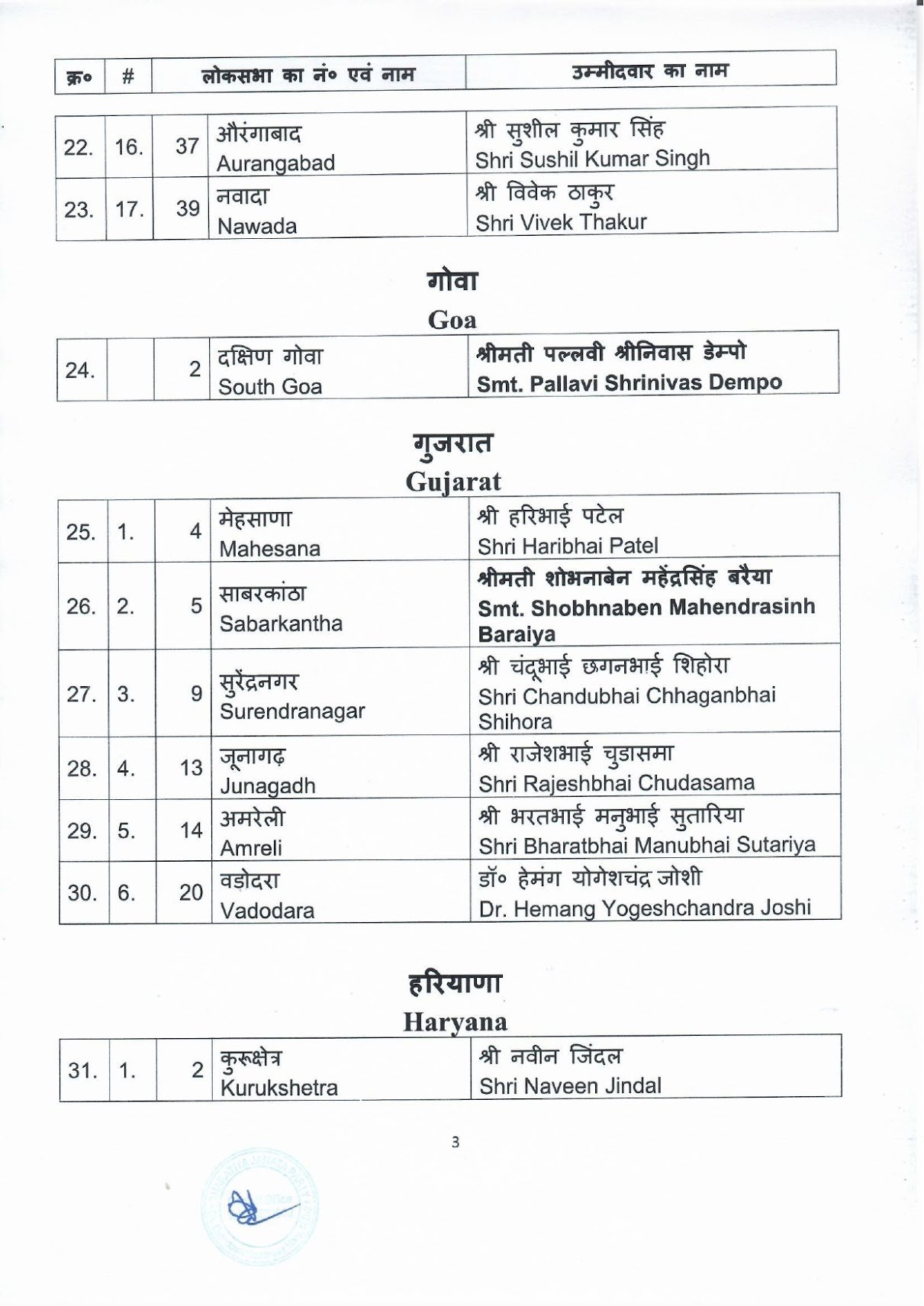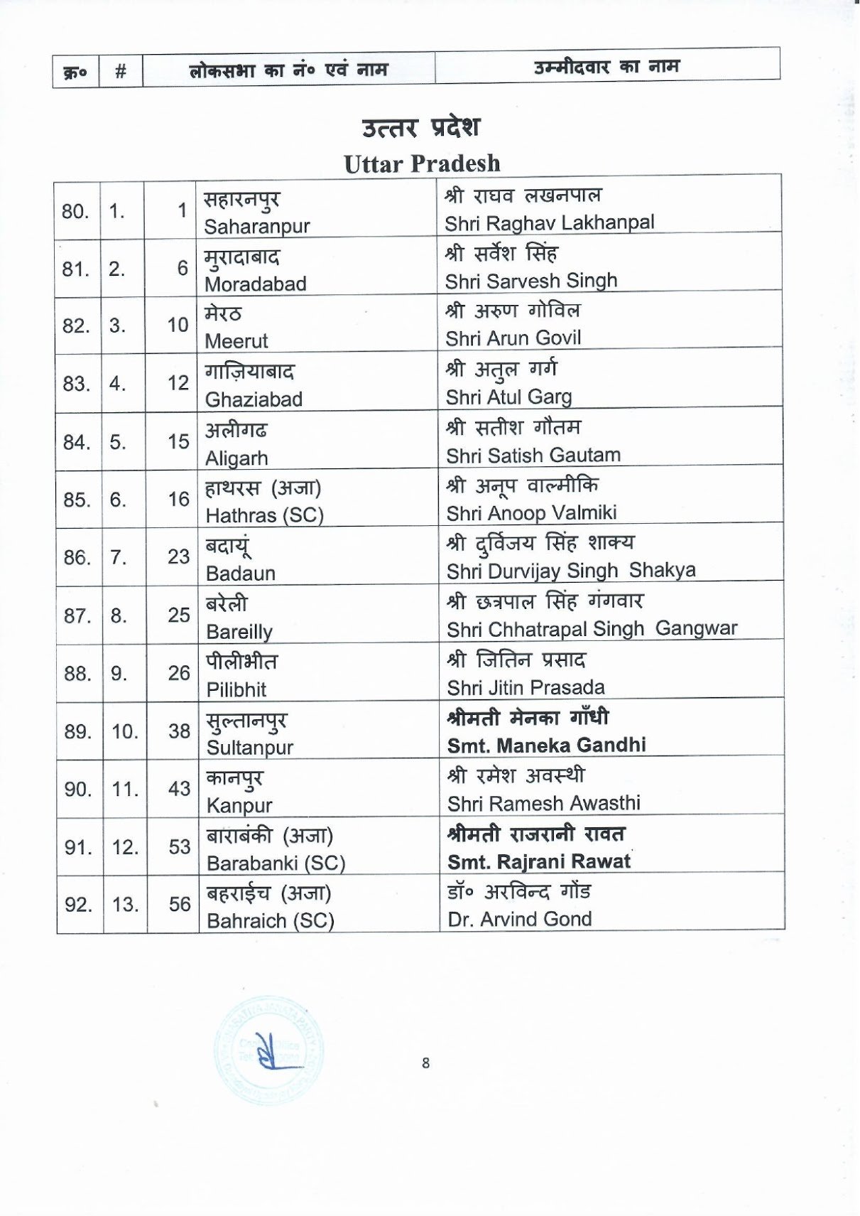 गाजियाबाद से केंद्रीय मंत्री वीके सिंह का टिकट काटकर अतुल गर्ग को टिकट दिया गया है. बीजेपी ने टिकट कटने की अटकलों के बाद भी मेनका गांधी को सुल्तानपुर से टिकट दिया है. वहीं कांग्रेस से बीजेपी में आए जितिन प्रसाद को पीलीभीत से उम्मीदवार बनाया गया है और वरुण गांधी को इस बार मौका नहीं दिया है.