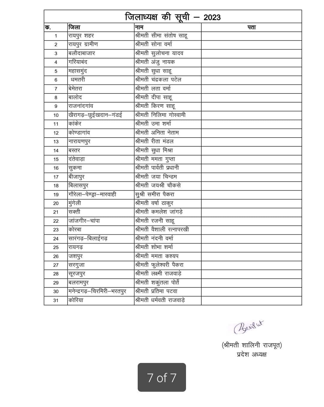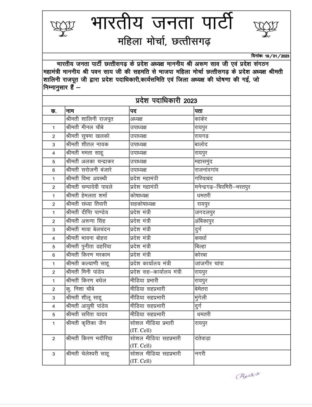 BREAKING: BJP महिला मोर्चा ने जिला अध्यक्षों सहित प्रदेश कार्यकारिणी की घोषित, देखिए किस-किसको मिली जिम्मेदारी