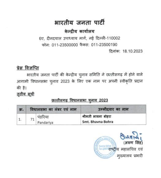 छत्तीसगढ़ विधानसभा चुनाव के लिए भारतीय जनता पार्टी ने बुधवार को तीसरी लिस्ट जारी की है। तीसरी लिस्ट में पार्टी ने एक ही उम्मीदवार की घोषणा की है। भाजपा ने पंडरिया विधानसभा से महिला प्रत्याशी भावना बोहरा को मैदान में उतारा है।