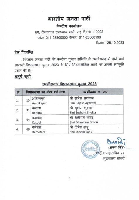 CG ब्रेकिंग: BJP ने चौथी लिस्ट की जारी, छत्तीसगढ़ में इन्हें बनाया प्रत्याशी