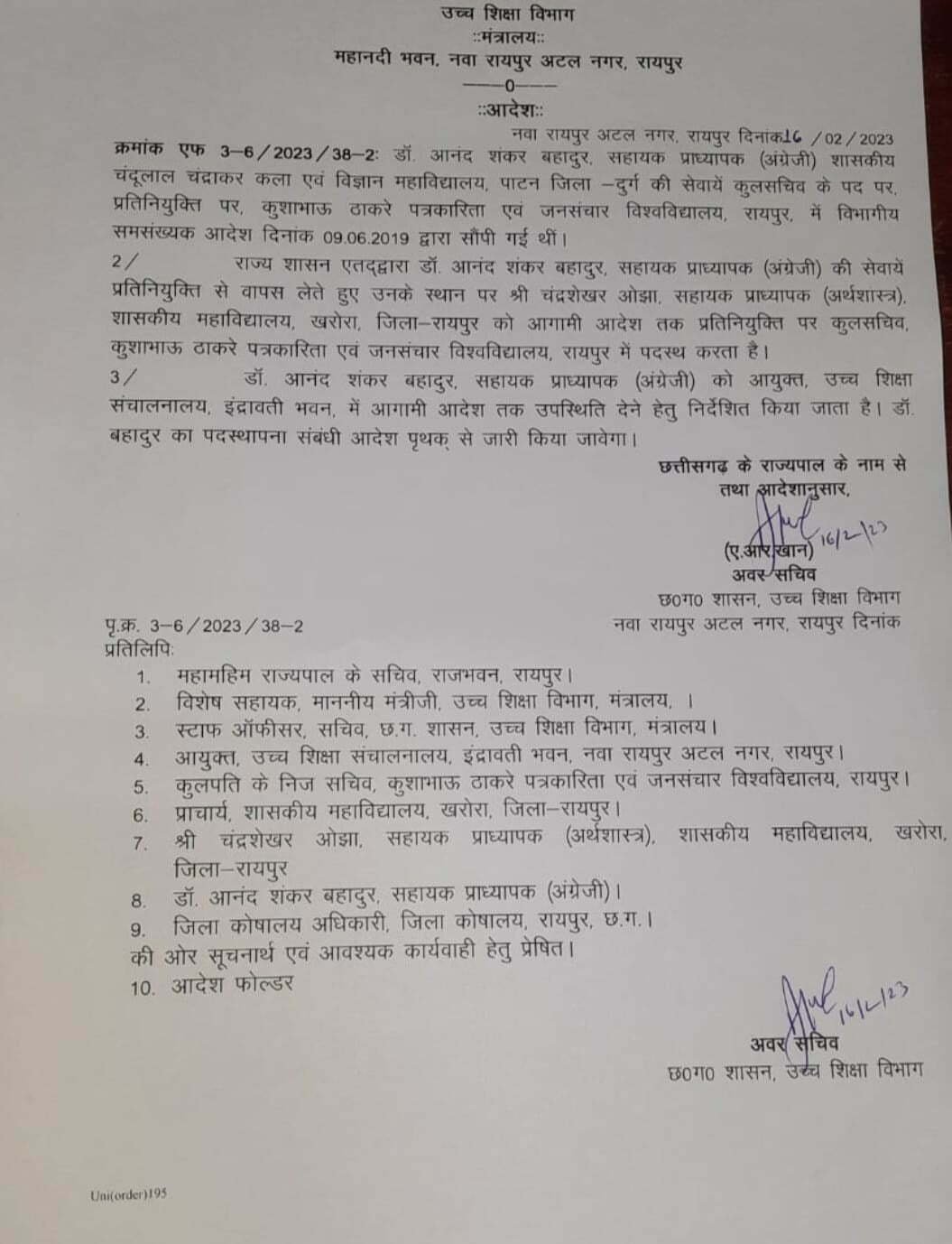 राज्य सरकार ने कुशाभाऊ ठाकरे पत्रकारिता विश्वविद्यालय के रजिस्ट्रार के पद से आनंद शंकर बहादुर की छुट्टी कर दी है। उनकी जगह शासकीय महाविद्यालय खरोरा के अर्थशास्त्र के सहायक प्राध्यापक चंद्रशेखर ओझा को विश्वविद्यालय का रजिस्ट्रार बनाया गया है।