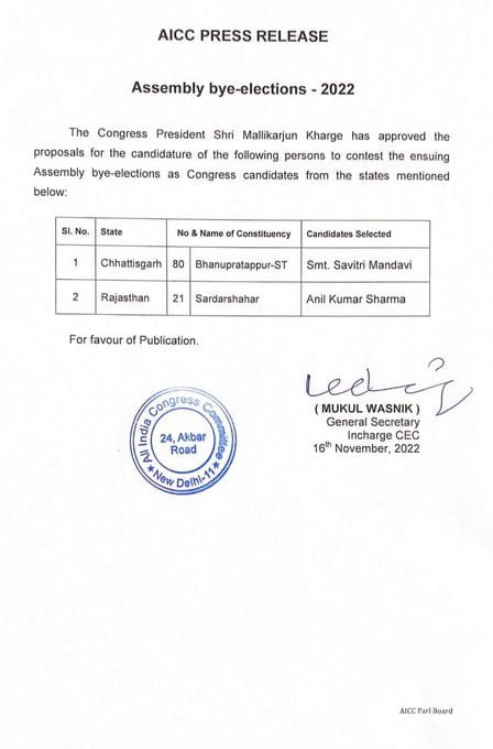 BREAKING : भानुप्रतापपुर उपचुनाव के लिए कांग्रेस ने भी की प्रत्याशी की घोषणा, इन्हें उतारा मैदान में