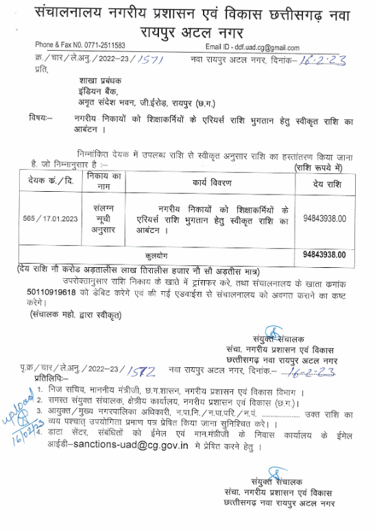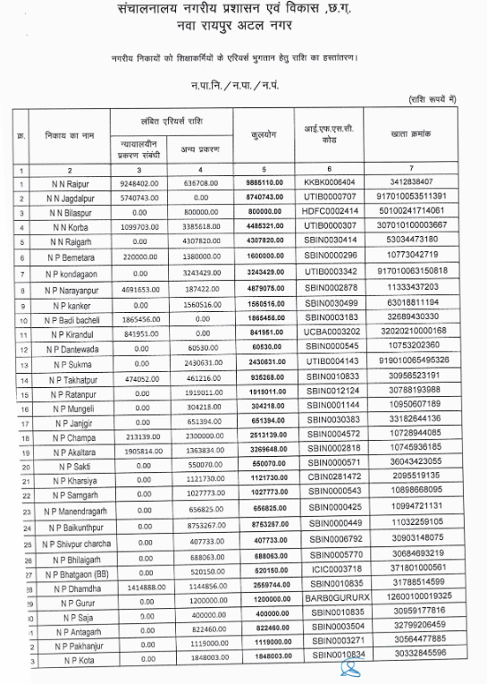 नगरीय निकाय में पदस्थ रहे शिक्षाकर्मियों के लिए अच्छी खबर है। उन्हें जल्द ही एरियर्स किया जाएगा। 64 निकायों के शिक्षाकर्मियों के एरियर्स भुगतान के लिए राज्य सरकार ने 9 करोड़ से ज्यादा की राशि आबंटित की है।
