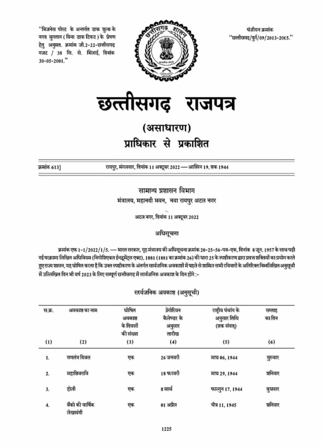 छत्तीसगढ़ में साल 2023 की छुट्टियों का कैलेंडर जारी, सिर्फ इतने दिन ही मिलेगा कर्मचारियों को अवकाश, यहां देखिए पूरी सूची