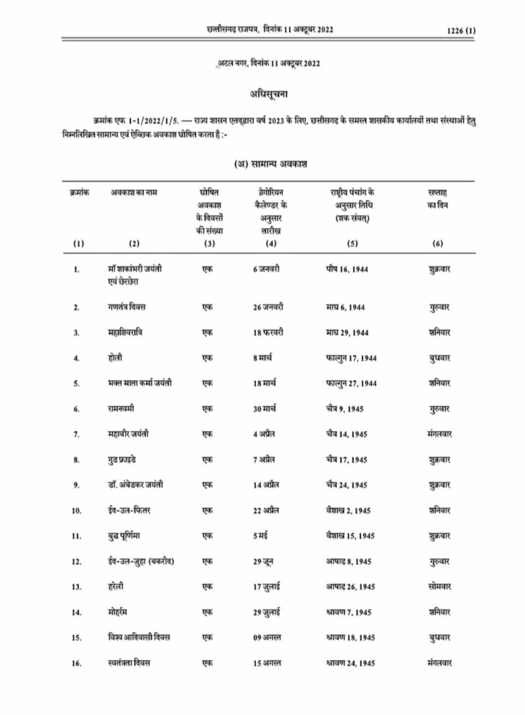 दरअसल सामान्य प्रशासन विभाग ने साल 2023 के लिए सार्वजनिक, सामान्य और ऐच्छिक अवकाश की अधिसूचना प्रकाशित कर दी है. जिसमें 17 दिन सार्वजनिक अवकाश के तौर पर दिए गए हैं.