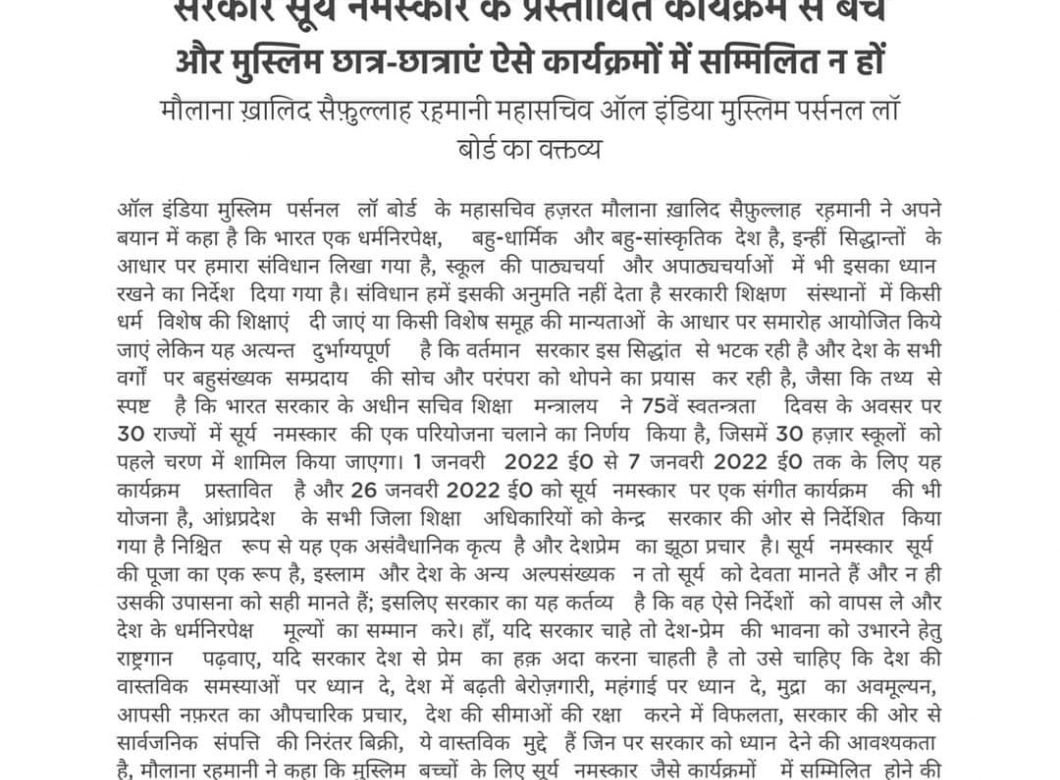 सूर्य नमस्कार के सरकारी आदेश का मुस्लिम लॉ बोर्ड ने