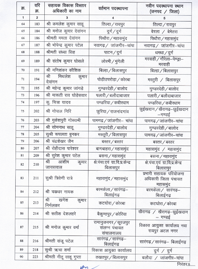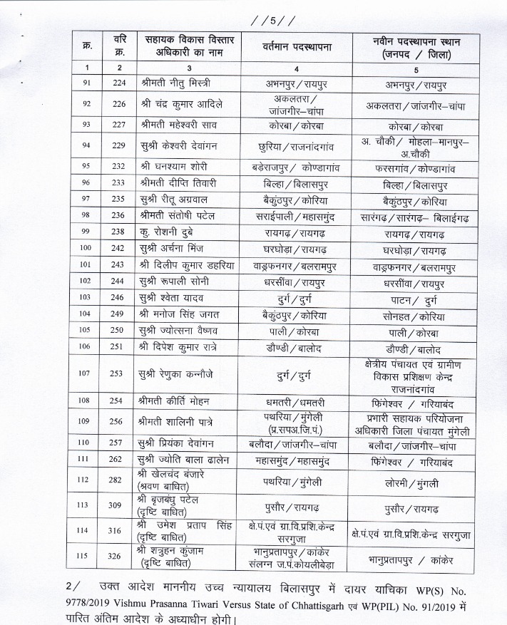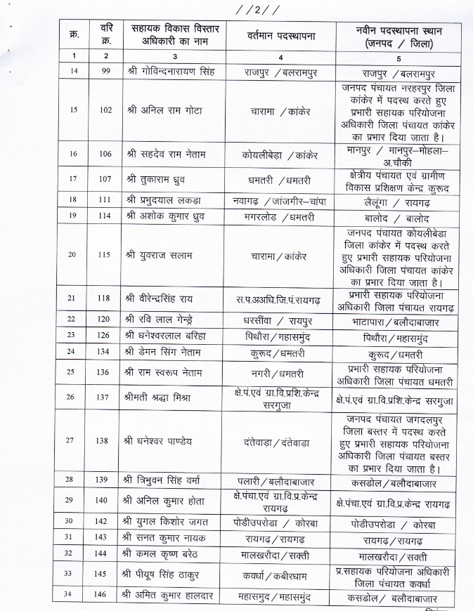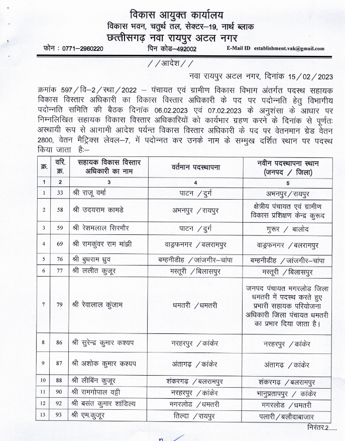 राज्य सरकार ने एक बार फिर बड़े पैमाने पर प्रमोशन और ट्रांसफर ऑर्डर जारी किया है। सरकार ने पंचायत एवं ग्रामीण विकास विभाग में पदस्थ 115 सहायक विकास विस्तार अधिकारी का विकास विस्तार अधिकारी के पद पर प्रमोशन किया है। इसके साथ ही इनका तबादला कर ऩई जगह इन्हें पोस्टिंग दी गई है।