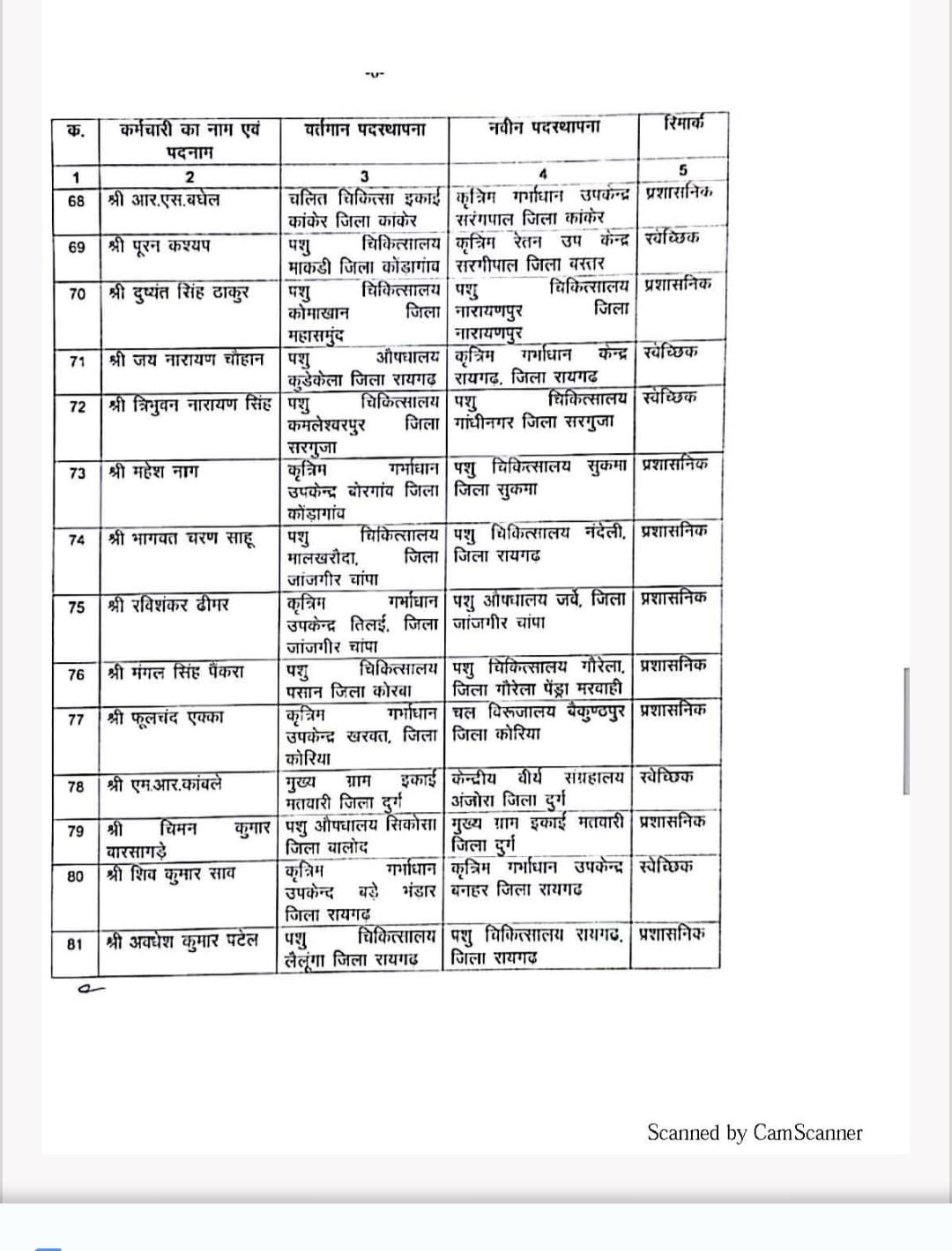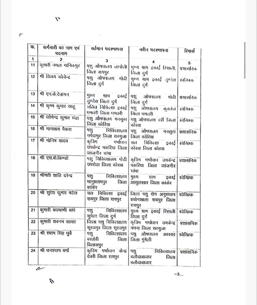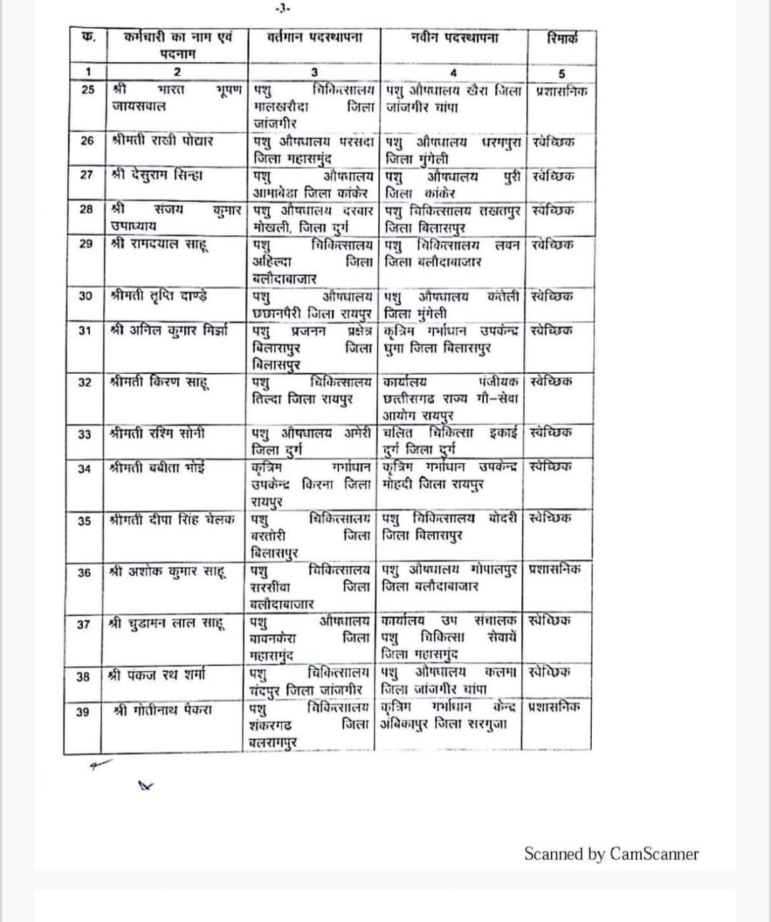 राज्य शासन ने अब पशुधन विकास विभाग में बड़े पैमाने पर तबादला किया है। विभाग में पदस्थ 174 अधिकारियों को इधर से उधर ट्रांसफर किया गया है। जिसमें कि 79 सहायक वेटनरी सर्जन और 95 सहायक पशु चिकित्सा क्षेत्र अधिकारी (तृतीय श्रेणी कार्यपालिक) शामिल हैं।