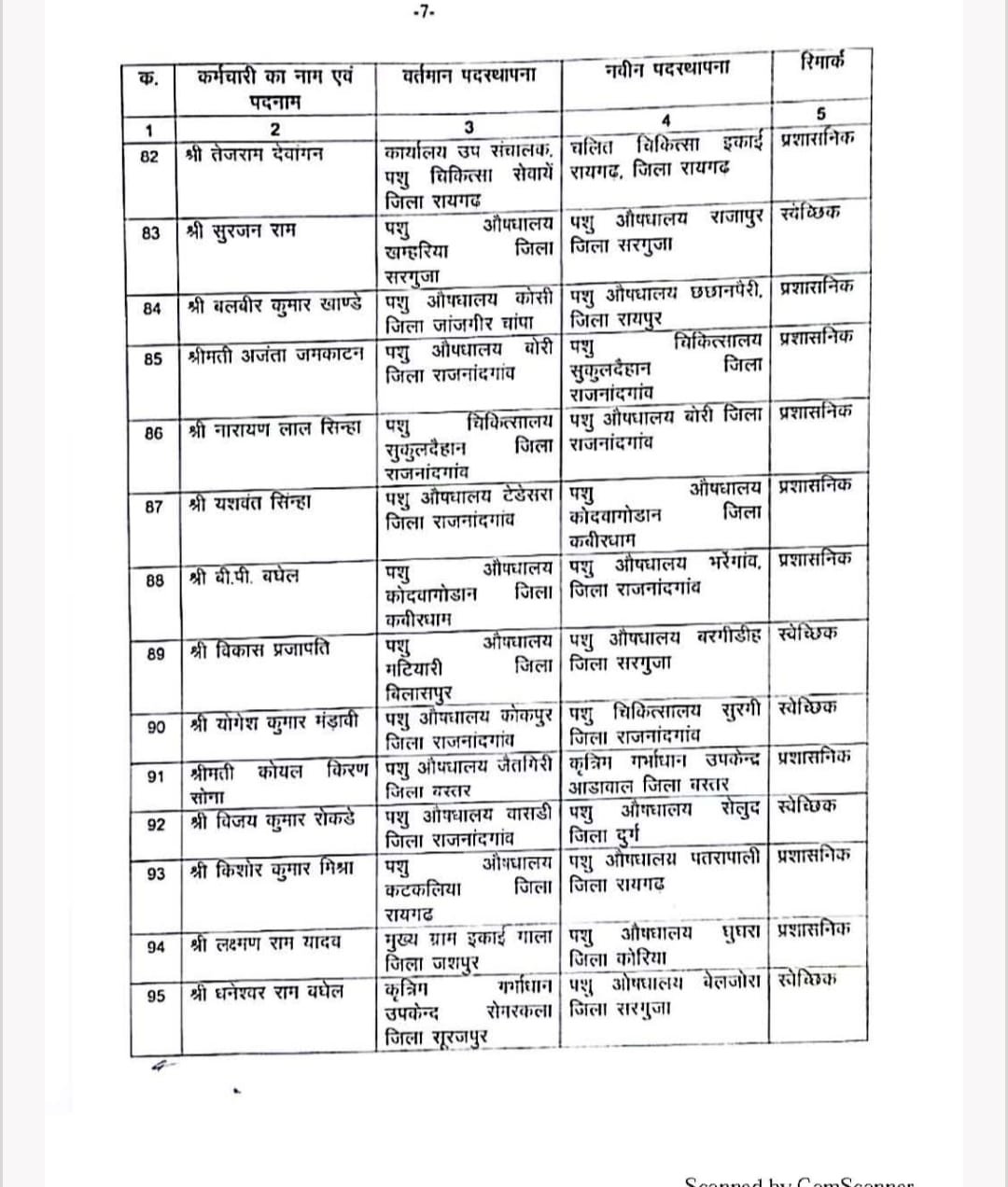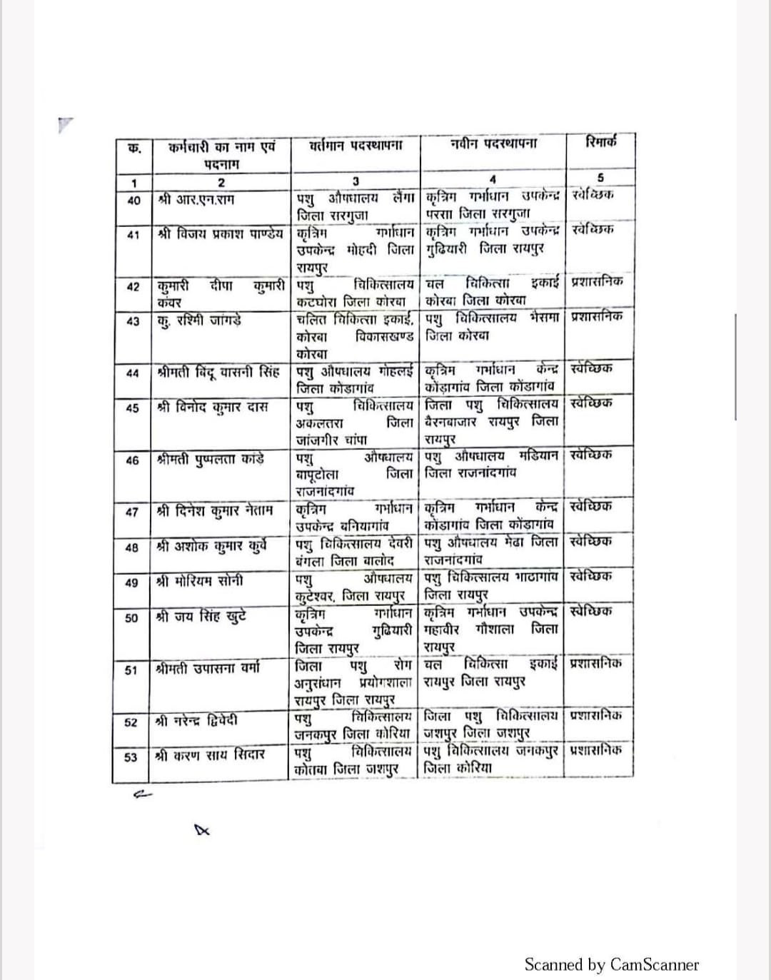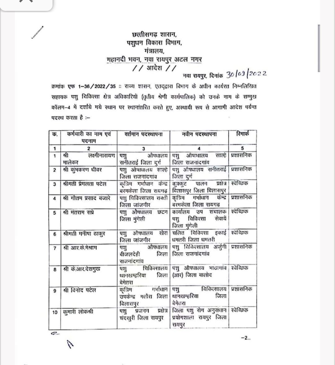राज्य शासन ने अब पशुधन विकास विभाग में बड़े पैमाने पर तबादला किया है। विभाग में पदस्थ 174 अधिकारियों को इधर से उधर ट्रांसफर किया गया है। जिसमें कि 79 सहायक वेटनरी सर्जन और 95 सहायक पशु चिकित्सा क्षेत्र अधिकारी (तृतीय श्रेणी कार्यपालिक) शामिल हैं।
