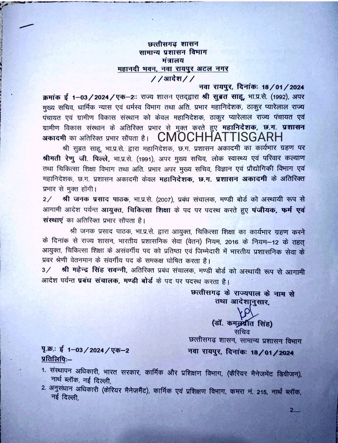 सरकार ने आइएएस अफसर सुब्रत साहू को छत्तीसगढ़ प्रशासन अकादमी का महानिदेशक का अतिरिक्त प्रभार सौंपा है। वहीं इएएस रेणु जी पिल्ले को इस दायित्व से मुक्त किया है। आइएएस जेपी पाठक को आयुक्त चिकित्सा शिक्षा के पद पर पदस्थ करते हुए पंजीयक फर्म एवं संस्थाएं का अतिरिक्त प्रभार सौंपा गया है। वहीं महेंद्र सिंह सवन्नी को प्रबंध संचालक मंडी बोर्ड पर पदस्थ किया गया है।