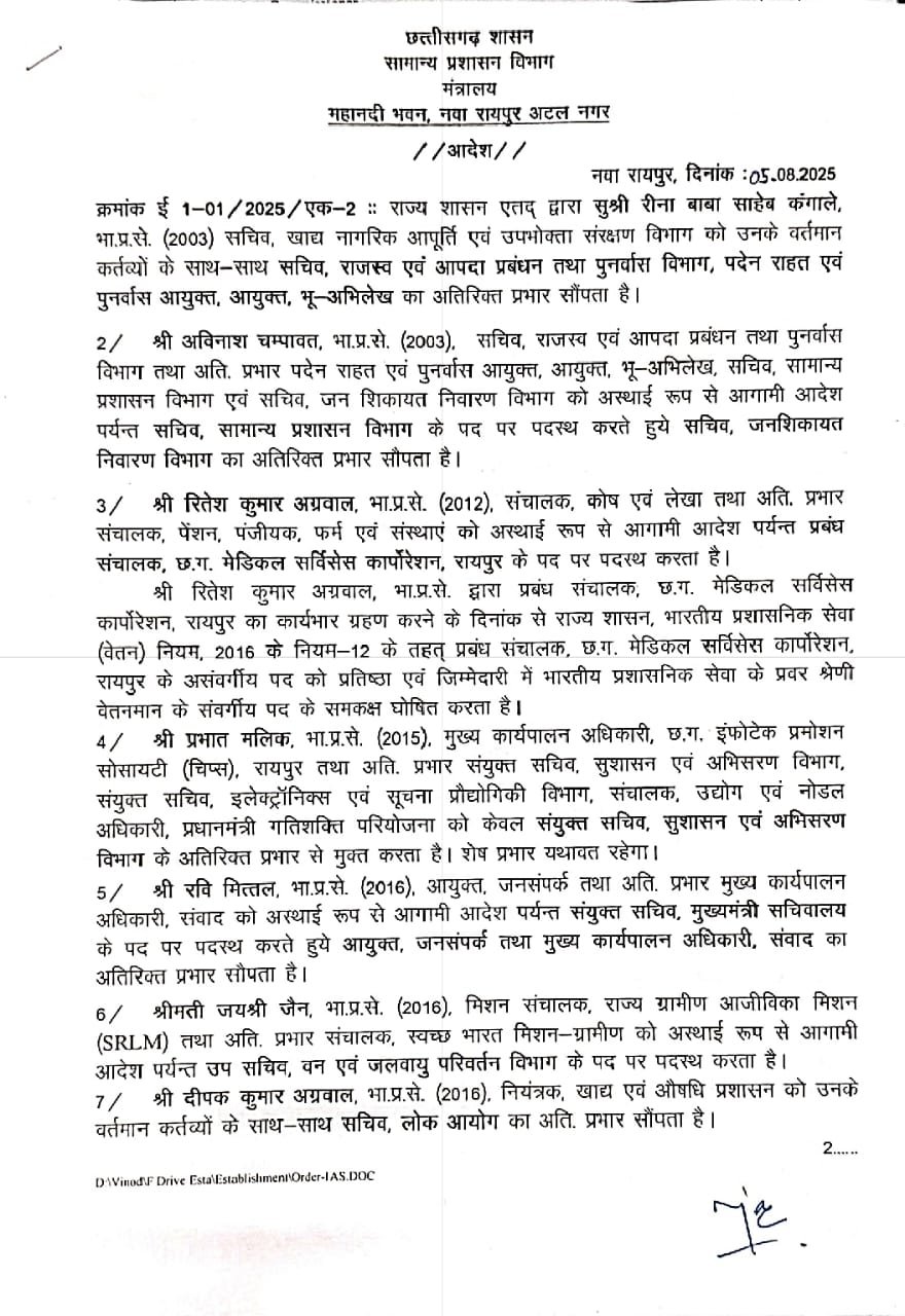 छत्तीसगढ़ में राज्य सरकार ने भारतीय प्रशासनिक सेवा के अफसरों के प्रभार में बड़ा बदलाव किया है। जनसंपर्क आयुक्त रवि मित्तल को सीएम सचिवालय में संयुक्त सचिव की भी जिम्मेदारी दी गई है।