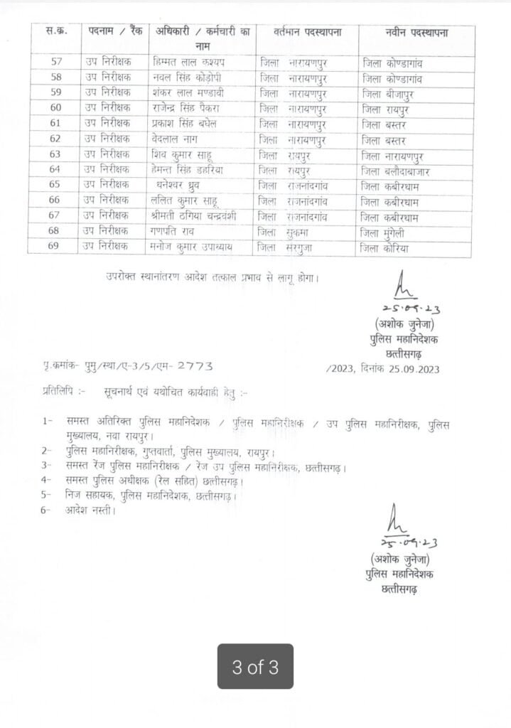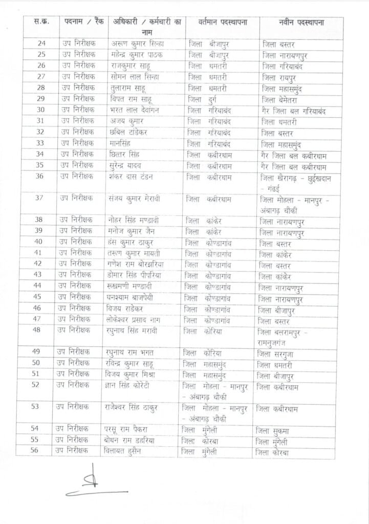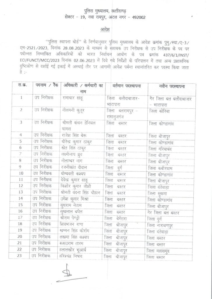 छत्तीसगढ़ पुलिस में एक बार फिर से बड़े पैमाने पर तबादला हुआ है। प्रदेश के विभिन्न जिलों के थानों में पदस्थ 69 सब इंस्पेक्टरों का एक ट्रांसफर किया गया है। इसे लेकर पीएचक्यू ने आदेश जारी किया है।