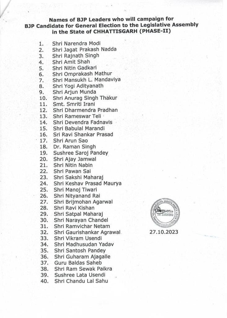 छत्तीसगढ़ विधानसभा चुनाव के दूसरे चरण के लिए बीजेपी ने अपने स्टार प्रचारकों की लिस्ट जारी कर दी है। लिस्ट में पीएम मोदी, राजनाथ सिंह, अमित शाह और सीएम योगी समेत 40 नेताओं का नाम है।