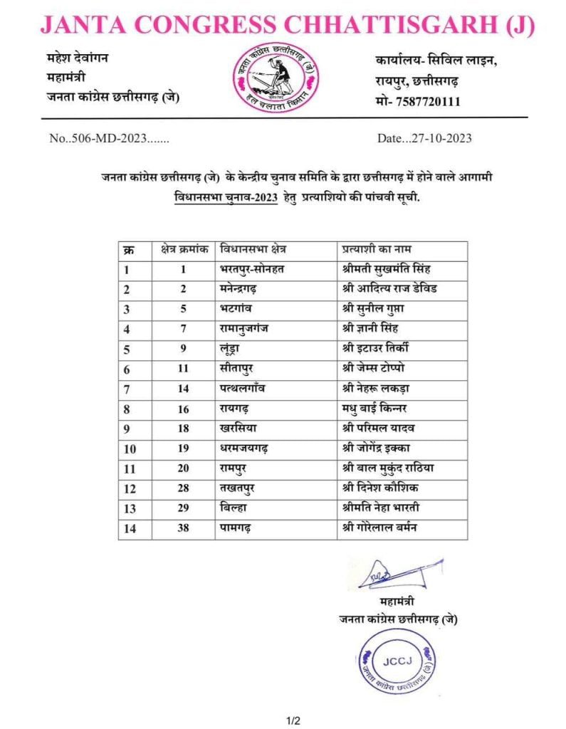 छत्तीसगढ़ विधानसभा चुनाव के लिए जनता कांग्रेस छत्तीसगढ़ (जे) ने पांचवी लिस्ट जारी की है। जोगी कांग्रेस ने इस लिस्ट में 27 प्रत्याशियों का नाम घोषित किया है। पार्टी ने पामगढ़ से कांग्रेस छोड़कर शामिल हुए गोरेलाल बर्मन को और रायगढ़ से पूर्व महापौर मधु बाई किन्नर को टिकट दिया है।