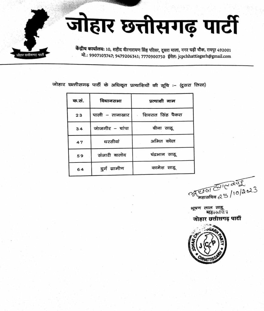 26/10/2023 जोहार छत्तीसगढ़ पार्टी ने प्रत्याशियों की दूसरी लिस्ट की जारी, अमित बघेल यहां से लड़ेंगे चुनाव Admin September 26, 2022 छत्तीसगढ़ विधानसभा चुनाव के लिए जोहार छत्तीसगढ़ पार्टी (JCP) ने प्रत्याशियों की दूसरी लिस्ट जारी कर दी है। पार्टी ने दूसरी लिस्ट में 5 प्रत्याशियों के नाम की घोषणा की है। पार्टी ने प्रदेश अध्यक्ष अमित बघेल को धरसींवा सीट से मैदान में उतारा है।देखिए सूची Related News: Big Breaking: नंदकुमार साय कांग्रेस में हुए शामिल, CM भूपेश और मोहन मरकाम ने दिलाई सदस्यता ED Raid: छत्तीसगढ़ में CM के बेहद करीबियों के ठिकानों पर ED का छापा, भूपेश बघेल ने बताया बर्थडे गिफ्ट सीएम भूपेश ने ED, IT और CBI को बताया लोकतंत्र के लिए खतरा, अडानी पर दिया ये सनसनीखेज बयान