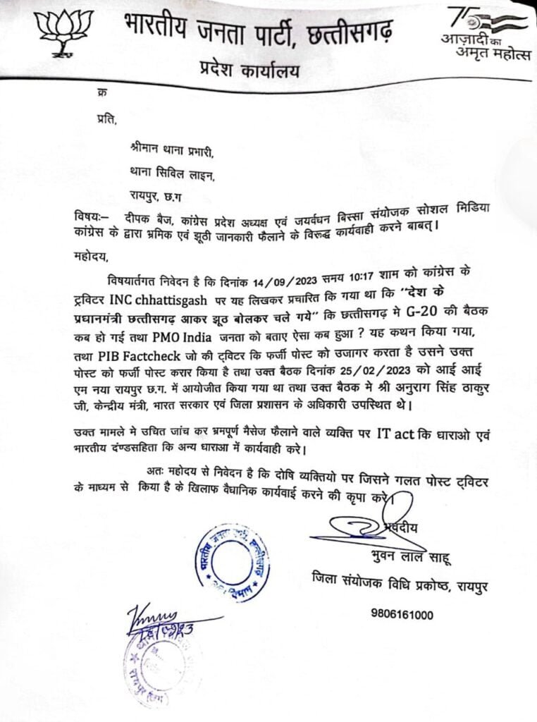 बीजेपी ने थाना में दी गई अपनी शिकायत में कहा है कि 14 सितंबर की शाम 10:17 मिनट पर कांग्रेस के ट्विटर अकाउंट INC chhattisgarh पर एक पोस्ट डाली गई। जिसमें कहा गया कि देश के प्रधानमंत्री छत्तीसगढ़ आकर झूठ बोलकर चले गए। छत्तीसगढ़ में जी-20 की बैठक कब हो गई और पीएमओ इंडिया जनता को बताए ऐसा कब हुआ?