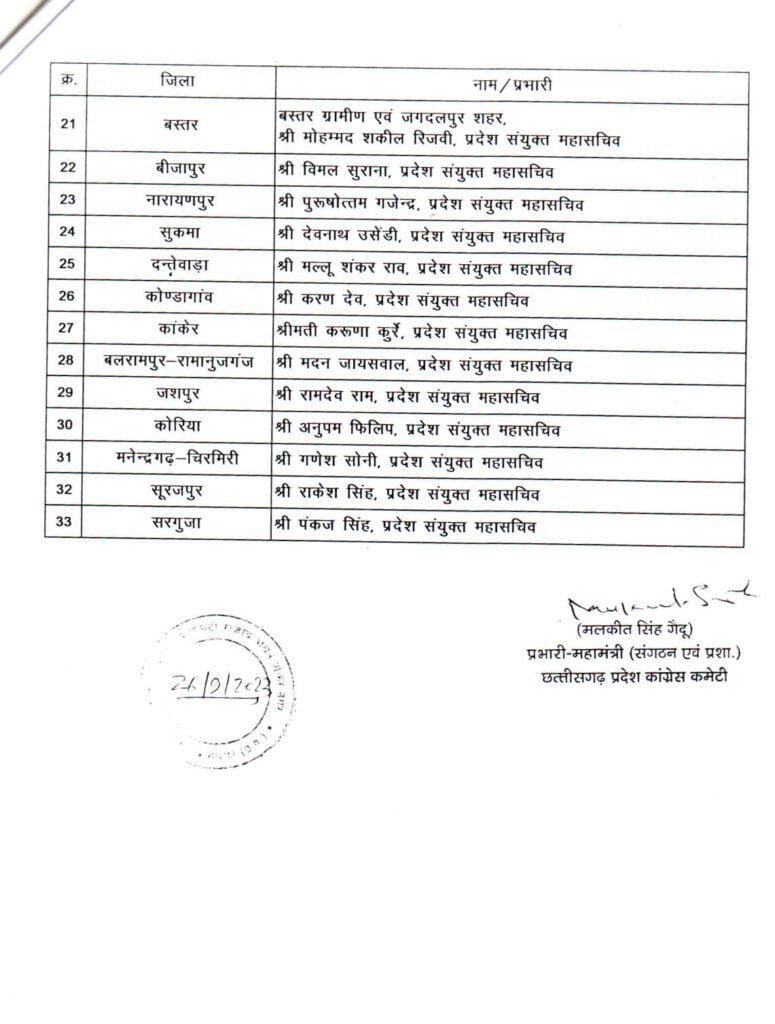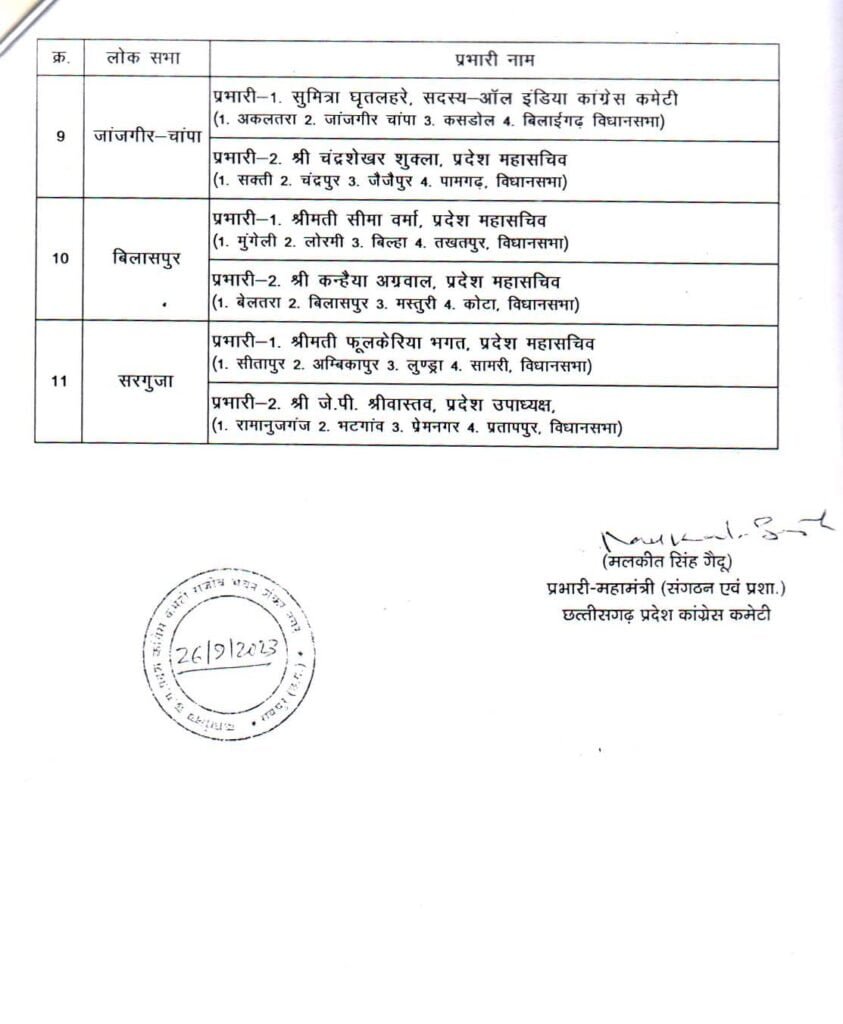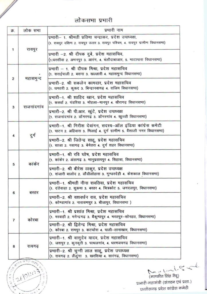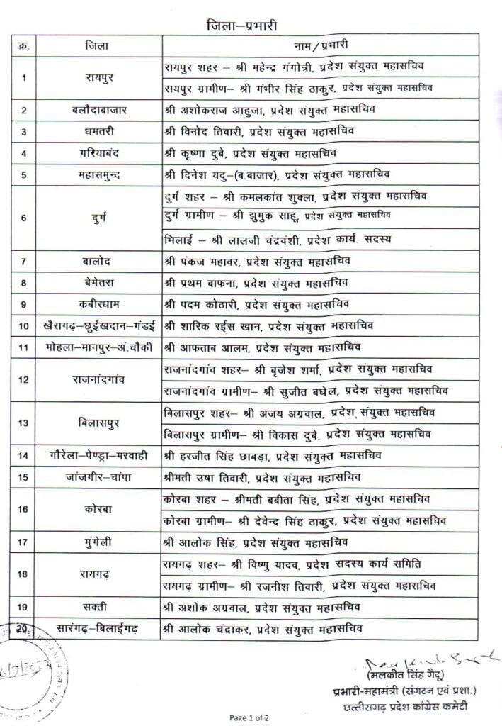 26/09/2023 Breaking: कांग्रेस ने लोकसभा, विधानसभा और जिला प्रभारियों की सूची की जारी, देखिए किसे कहां की मिली जिम्मेदारी Admin September 26, 2022 छत्तीसगढ़ में इस साल के अंत में विधानसभा चुनाव होना है। चुनाव के मद्देनजर कांग्रेस ने लोकसभा, विधानसभा और जिला प्रभारियों की नियुक्ति की है। देखिए सूची Related News: Big Breaking: नंदकुमार साय कांग्रेस में हुए शामिल, CM भूपेश और मोहन मरकाम ने दिलाई सदस्यता ED Raid: छत्तीसगढ़ में CM के बेहद करीबियों के ठिकानों पर ED का छापा, भूपेश बघेल ने बताया बर्थडे गिफ्ट सीएम भूपेश ने ED, IT और CBI को बताया लोकतंत्र के लिए खतरा, अडानी पर दिया ये सनसनीखेज बयान