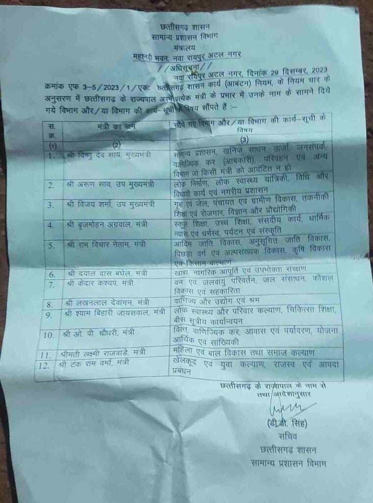Breaking: छत्तीसगढ़ में मंत्रियों के विभागों का बंटवारा, CM विष्णुदेव, बृजमोहन, ओपी चौधरी सहित सभी मंत्रियों के पास रहेंगे ये-ये विभाग