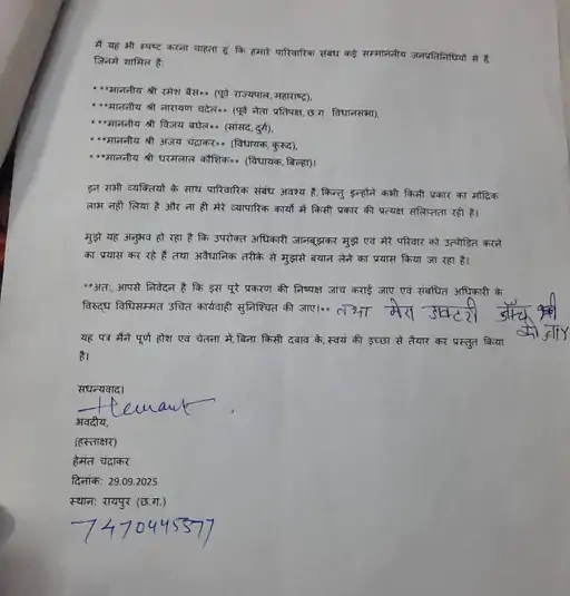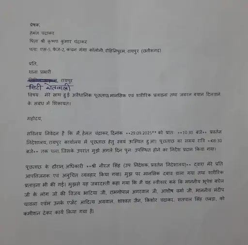 कांग्रेस नेता हेमंत चंद्राकर ने 29 सितंबर को सुबह 10:30 बजे रायपुर ED कार्यालय में पूछताछ के लिए बुलाया जाना बताया। पूछताछ रात 8:30 बजे तक चली, उसके बाद अगले दिन फिर हाजिर होने को कहा गया। शिकायत के अनुसार, ED अधिकारियों ने उन पर पूर्व CM भूपेश बघेल और उनके करीबियों- विजय भाटिया, रामगोपाल अग्रवाल, आशीष वर्मा, मंदीप चावला आदि- के खिलाफ कमीशनखोरी के बयान देने का दबाव डाला।