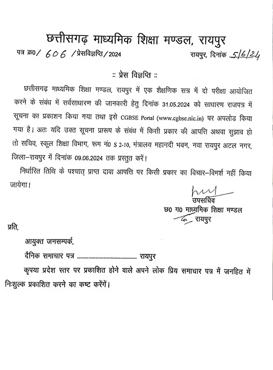 छत्तीसगढ़ में अब 10वीं और 12वीं की बोर्ड परीक्षाएं साल में दो बार आयोजित होगी। मुख्य परीक्षा में असफल छात्र असफल विषयों में दोबारा परीक्षा दे सकेंगे। इसे लेकर गैजेट नोटिफिकेशन जारी किया गया है। प्रथम मुख्य परीक्षा फरवरी-मार्च में आयोजित की जाएंगी। वहीं दूसरी बार जून के तीसरे सप्ताह में मुख्य परीक्षाएं होंगी। परीक्षार्थी को द्वितीय परीक्षा में शामिल होने के लिए पहली परीक्षा के लिए आवेदन करना होगा।