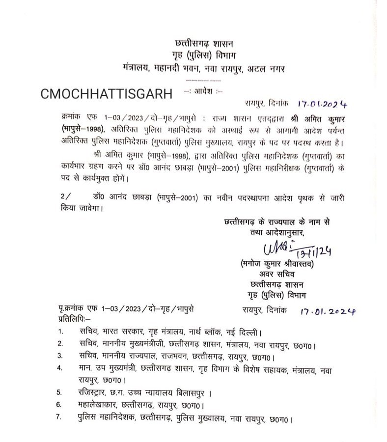 छत्तीसगढ़ में पुलिस विभाग के इंटेलिजेंस चीफ बदल गए हैं। राज्य सरकार ने आनंद छाबड़ा को इंटेलिजेंस विभाग से हटा दिया है। सरकार ने उनकी जगह आईपीएस अफसर अमित कुमार को इंटेलिजेंस का चीफ बनाया है। अमित कुमार हाल ही में केन्द्रीय प्रतिनियुक्ति से छत्तीसगढ़ वापस लौटे हैं। फिलहाल आईजी आनंद छाबड़ा की अभी नवीन पदस्थापना नहीं की गई है।