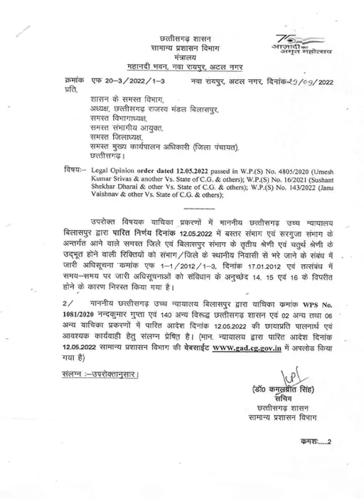 सामान्य प्रशासन विभाग की ओर से जारी पत्राचार में कहा गया कि हाईकोर्ट की ओर से पारित निर्णय दिनांक 12-5-2022 में बस्तर संभाग और सरगुजा संभाग के अंतर्गत आने वाले सभी जिलों और बिलासपुर संभाग के तृतीय श्रेणी और चतुर्थ श्रेणी की रिक्तियों को संभाग/जिलों के स्थानीय निवासियों से भरे जाने के संबंध में जारी अधिसूचनाओं को संविधान के अनुच्छेद 14, 15 और 16 के विपरीत होने की वजह से निरस्त किया गया है। मामले में पारित आदेश की छायाप्रति पालन और आवश्यक कार्यवाही के लिए प्रेषित है.