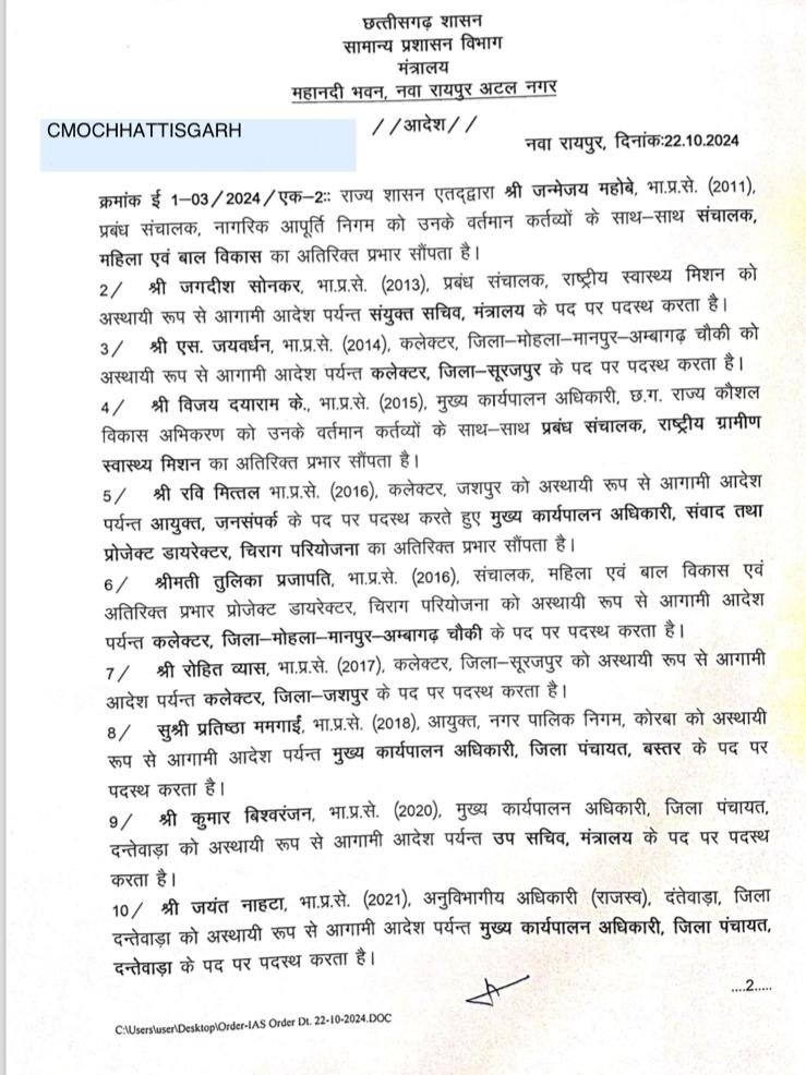 छत्तीसगढ़ में राज्य सरकार ने भारतीय प्रशासनिक सेवा (IAS) और भारतीय पुलिस सेवा (IPS) के अफसरों का तबादला किया है। सरकार ने 10 आईएएस अफसरों के प्रभार में बदलाव किया है। सरकार ने 2016 बैच के आईएएस अफसर रवि मित्तल को आयुक्त जनसंपर्क और संवाद के सीईओ के साथ ही प्रोजेक्ट डायरेक्टर चिराग परियोजना की जिम्मेदारी सौंपी है। रवि मित्तल इससे पहले जशपुर कलेक्टर के पद पर थे।
