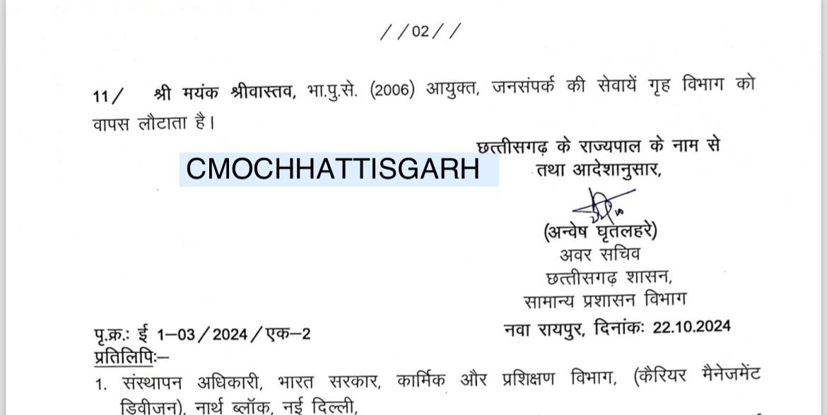 वहीं सरकार ने 2006 बैच के आईपीएस अफसर मयंक श्रीवास्तव की सेवाएं वापस गृह विभाग को लौटा दी है। मयंक श्रीवास्तव इससे पहले जनसंपर्क आयुक्त के पद पर थे।