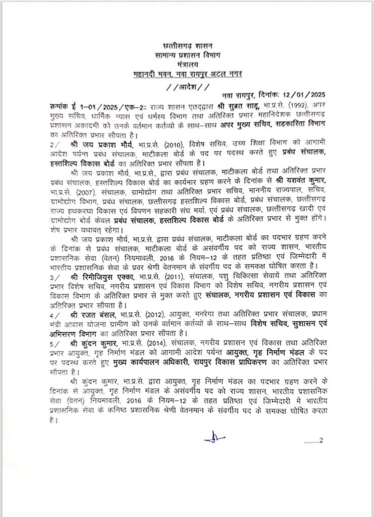 छत्तीसगढ़ में राज्य सरकार ने भारतीय प्रशासनिक सेवा (IAS) के अधिकारियों के प्रभार में बदलाव किया है। सरकार ने आधा दर्जन आईएएस अफसरों को पहले से मौजूद प्रभार के अलावा नए विभागों की जिम्मेदारी दी है।