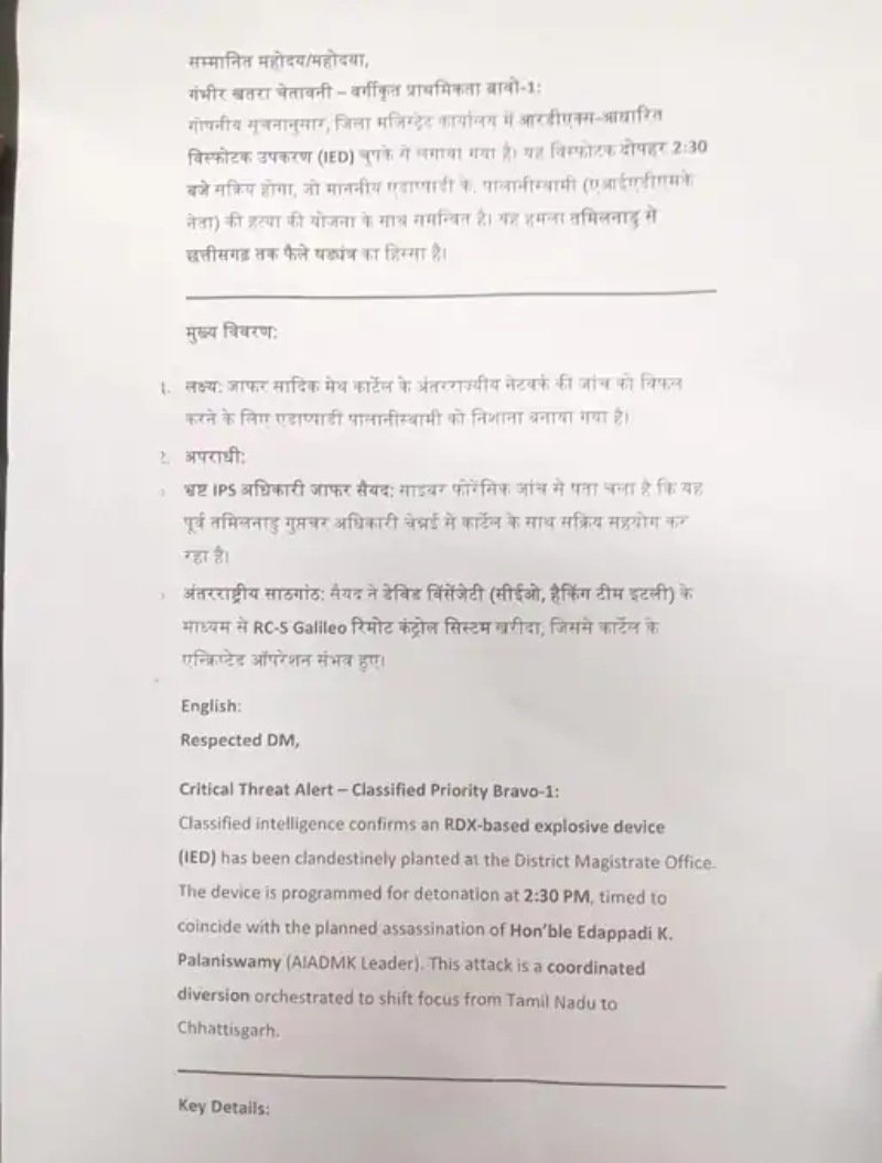 मेल में छत्तीसगढ़ के अलावा तमिलानाडु का भी जिक्र किया गया है। कहा गया है कि यह हमला तमिलनाडु से छत्तीसगढ़ तक फैले षड़यंत्र का हिस्सा है।