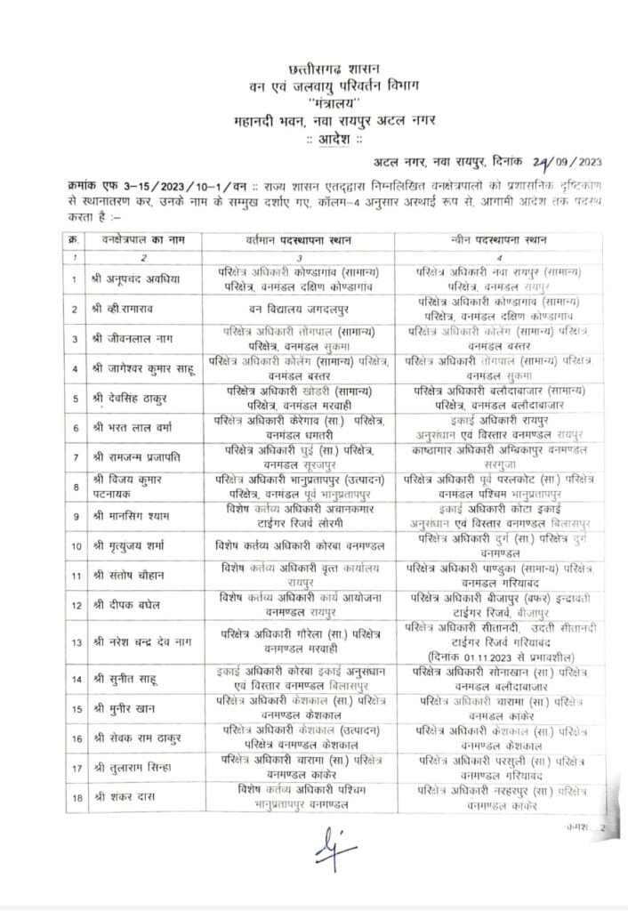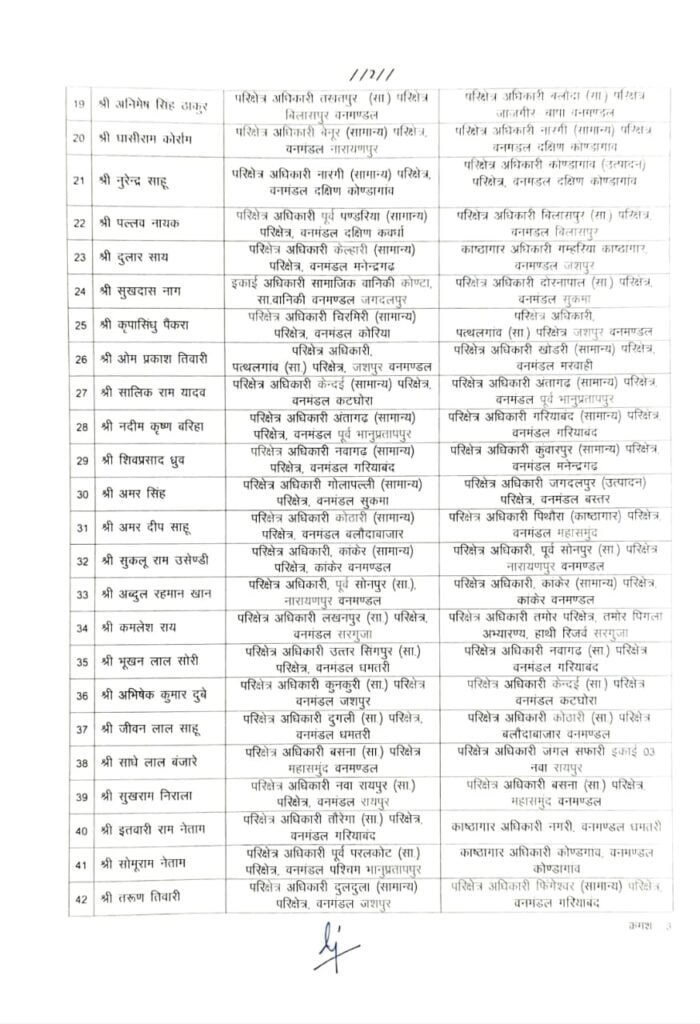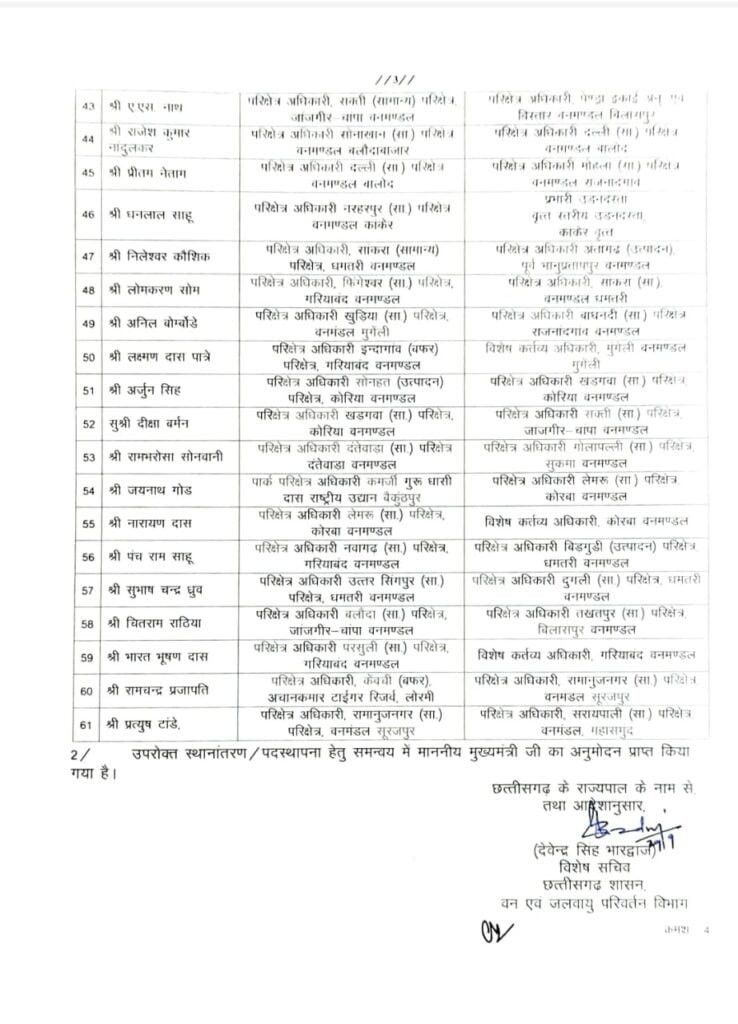 वन विभाग में बड़े पैमाने पर तबादला हुआ है। 61 अधिकारियों की नई पदस्थापना आदेश जारी किया गया है। देखिए सूची