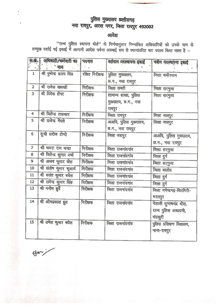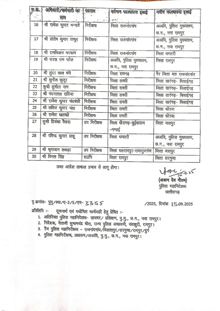 छत्तीसगढ़ के पुलिस महकमे में दो दर्जन से ज्यादा निरीक्षकों, उप निरीक्षकों और सहायक उपनिरीक्षक का तबादला किया गया है। डीजीपी अरुण देव गौतम के हस्ताक्षर से जारी सूची में एक बड़ी त्रुटि भी सामने आई है। इस सूची में दूसरे और 26वें नंबर पर सक्ती में पदस्थ निरीक्षक का नाम राजेश खलखो का नाम है। उनका तबादला सरगुजा और कोरबा जिले में कर दिया गया है।